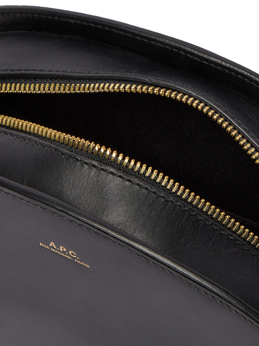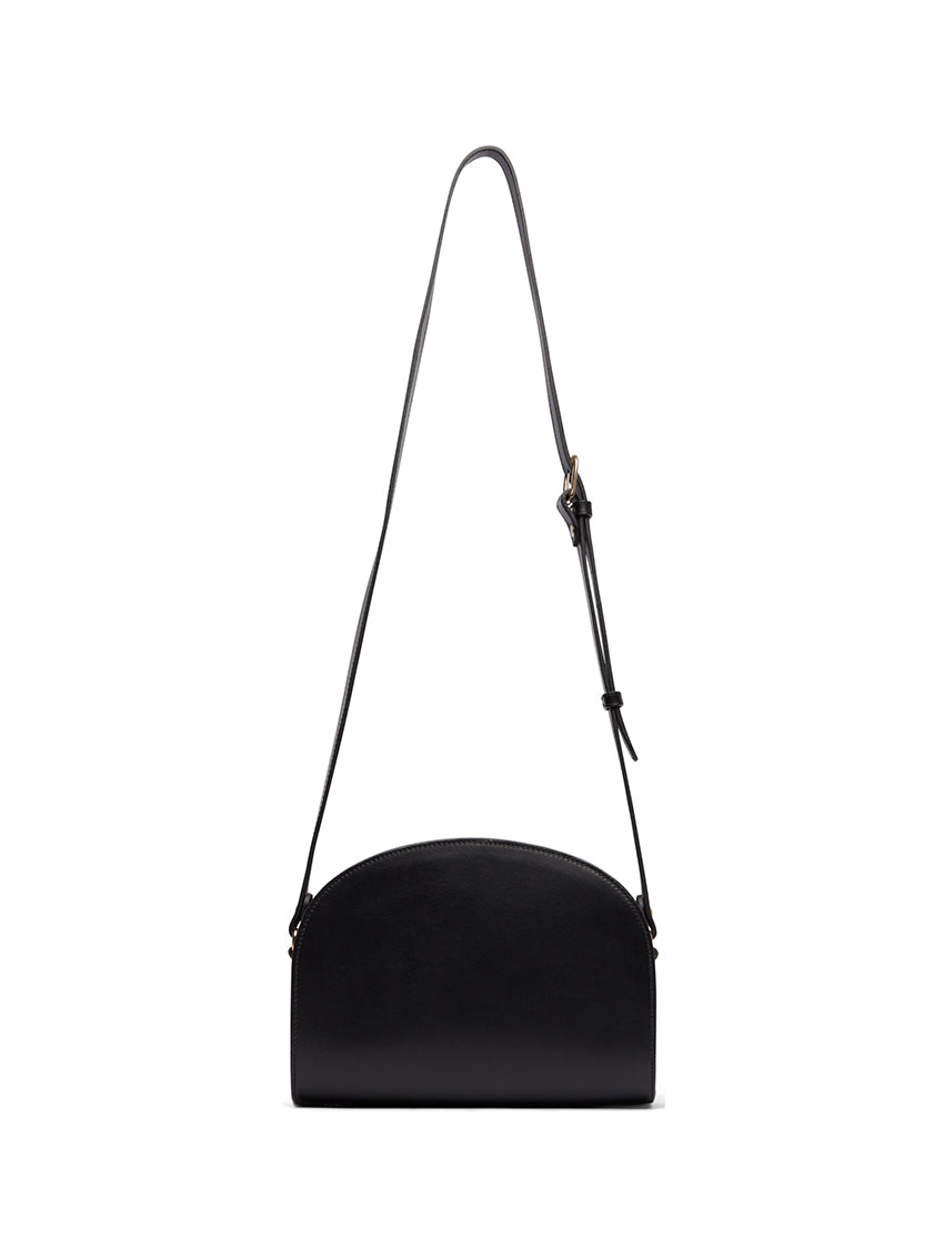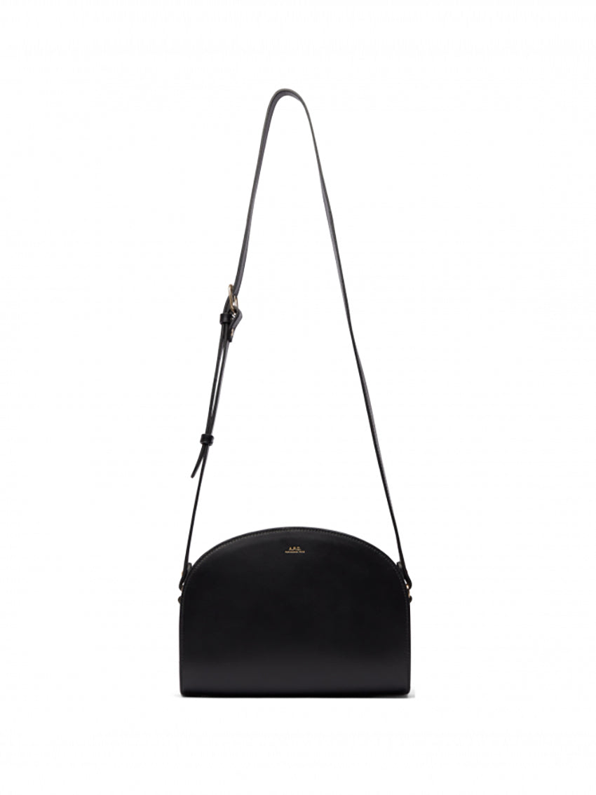 Black Demi-Lune Bag made of vegetable-tanned smooth leather conic A.P.C. Goldtone zip closure with double leather pull tabs. Interior pocket. Shoulder strap adjusts with a metal buckle. Can be worn on the shoulder or across the chest. Goldtone rivets on sides. embossed goldtone 'A.P.C. Rue Madame Paris' logo. Interior cotton lining. Shoulder strap: 50 cm. Dimensions: 24 x 20 x 8,5 cm. 100% leather. Spanish material. Made in Portugal. Vegetable-tanned leather is produced with natural tannins. Marks and traces that will develop on the leather are normal and are part of its natural patina process. Light colours will darken as well. Leather must be protected from the sun, heat and water. Care instructions: wipe with a soft, dry cloth.