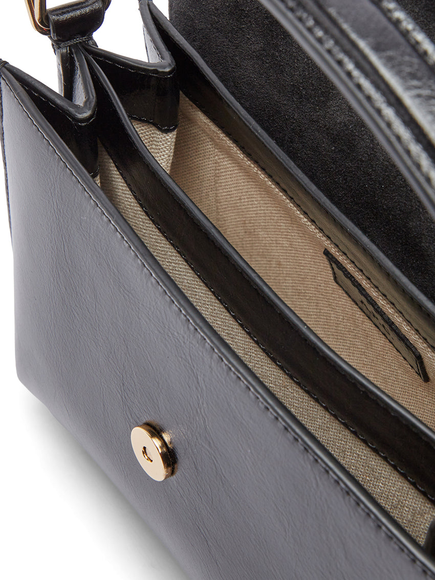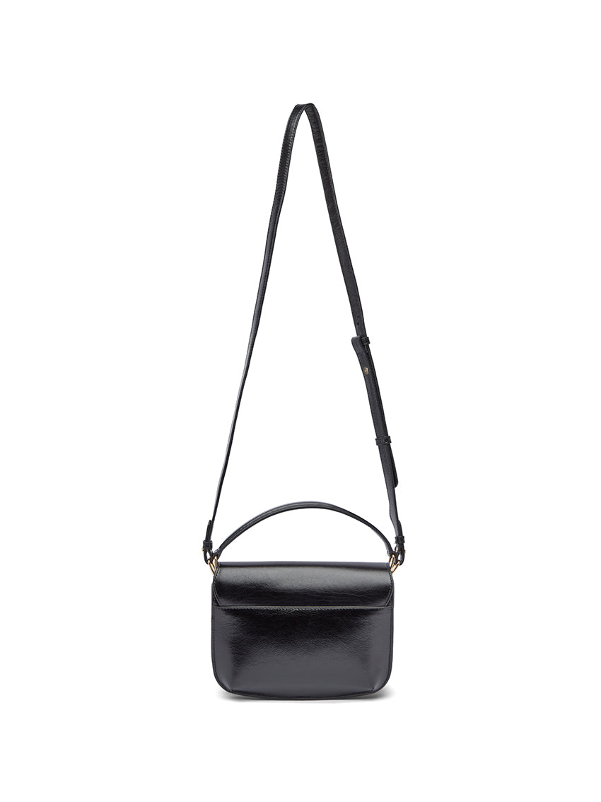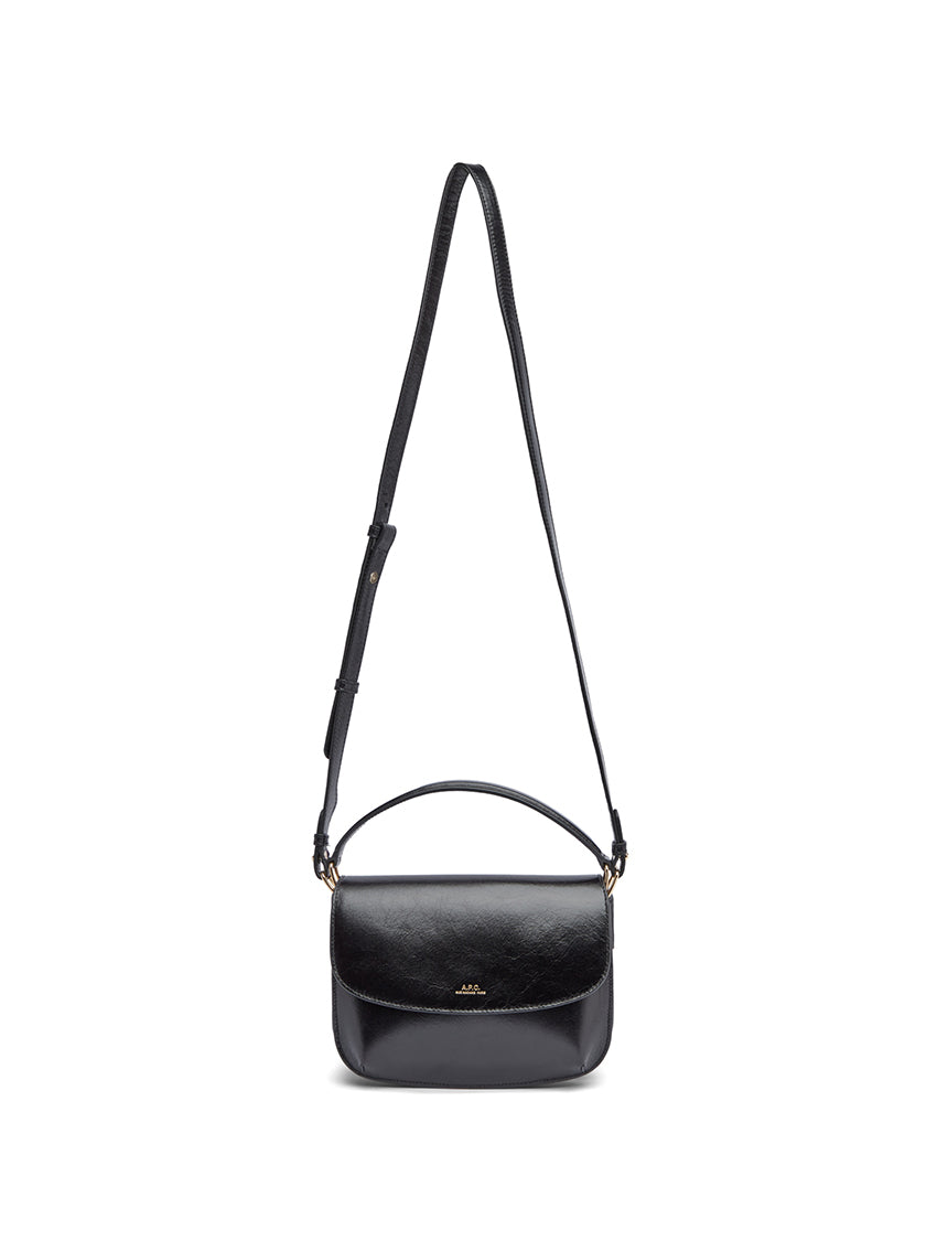 Sarah Mini pouch Bag with flap in shiny Black crinkled leather. Bag in crinkled leather. Premium cowhide leather. Magnetic flap closure. Strap adjusts to carry the bag on the Shoulder or across the chest, but can also be removed to carry the bag by hand with the handle. Rounded curved corners. Two compartments. One inside pocket. Embossed goldtone "A.P.C. Rue Madame Paris" logo. Cotton lining. Dimensions: 19 x 14 x 5 cm. Shoulder strap: 50 cm. 100% cowhide leather. Italian, Spanish and French material. Made in Morocco. Care instructions: wipe with a soft, dry cloth.
