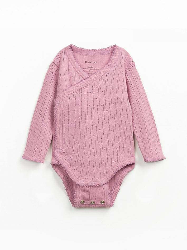 This Play Up Bodysuit is made of jersey fabric with a blend of organic cotton and recycled cotton, in Urze Rose color. It is an inner model with long sleeves and a V-neckline, featuring a wrap-over opening with a snap button on the inside and outside, and a crotch opening with nickel-free metal snaps. 50.0% Organic Cotton,50.0% Recycled Cotton