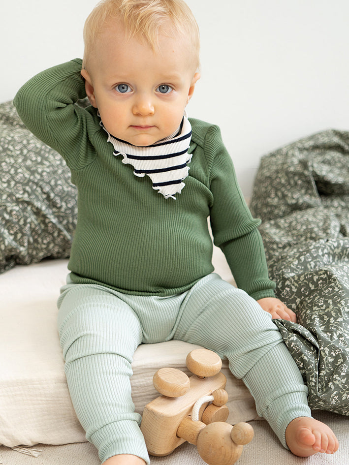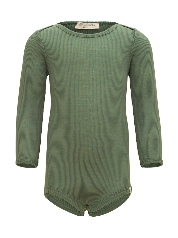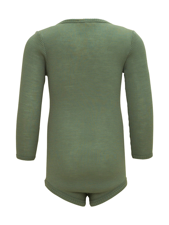 This bestselling long-sleeve rib Alaska Body in Greenery by Minimalisma features a soft envelope neck for convenient dressing and nappy changes; whether pulled up or down. This body is crafted from soft merino wool with self-fabric bindings around the leg-opening and three nickel-free YKK buttons for quick and easy outfit changes. Quality: 100% Merino Wool