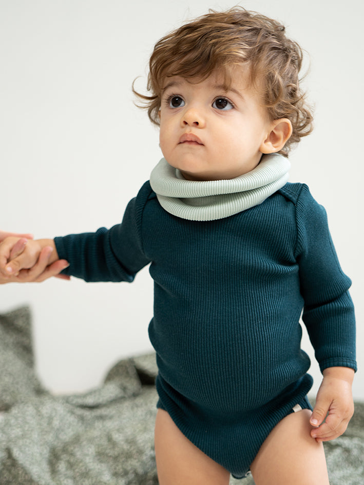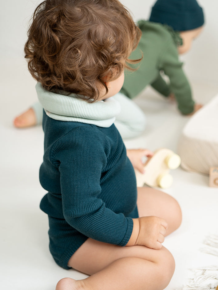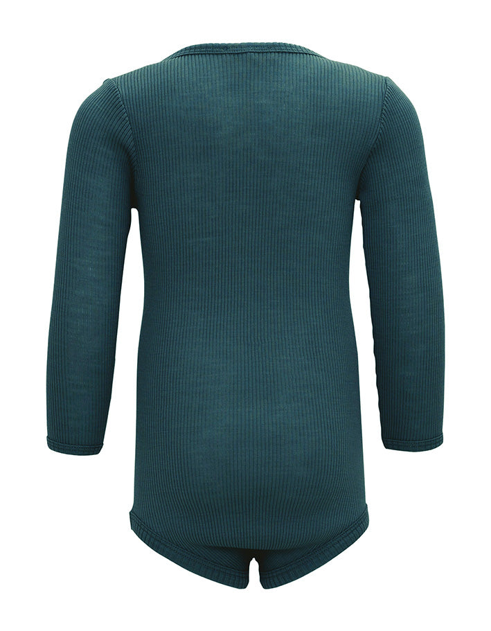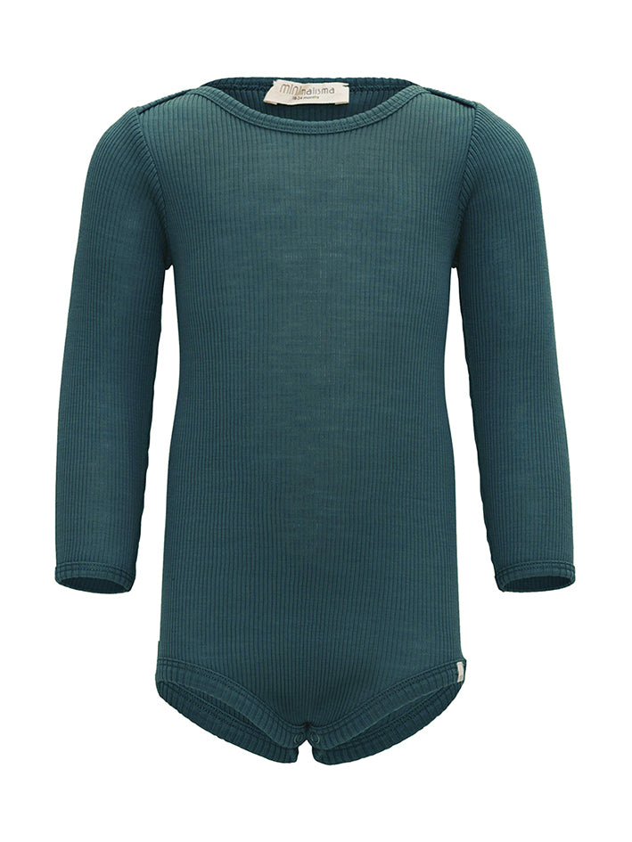 This bestselling long-sleeve rib Alaska Body in Ocean by Minimalisma features a soft envelope neck for convenient dressing and nappy changes; whether pulled up or down. This body is crafted from soft merino wool with self-fabric bindings around the leg-opening and three nickel-free YKK buttons for quick and easy outfit changes. Quality: 100% Merino Wool