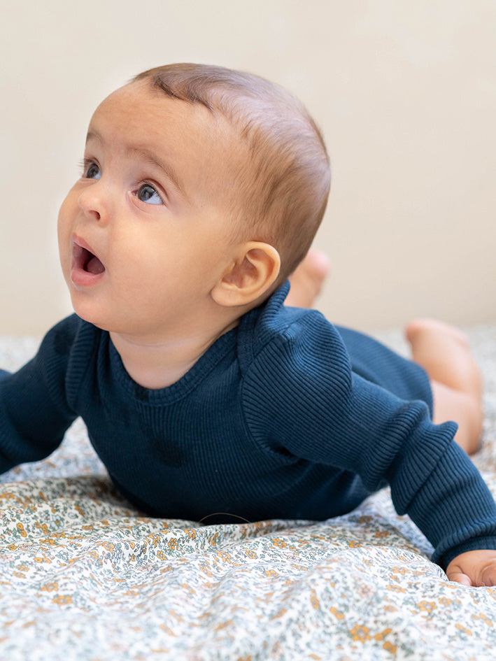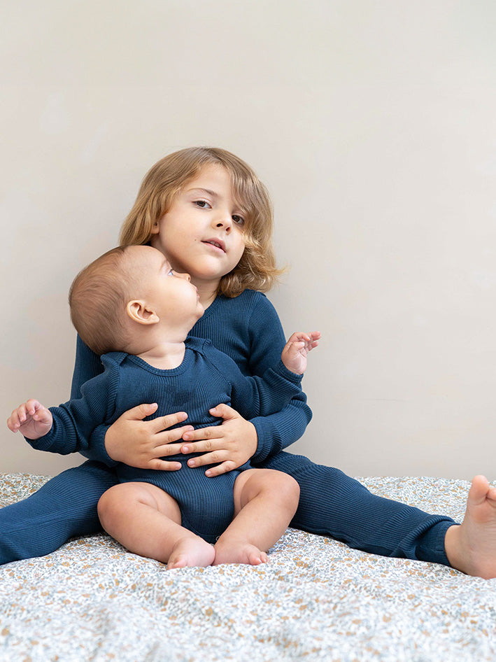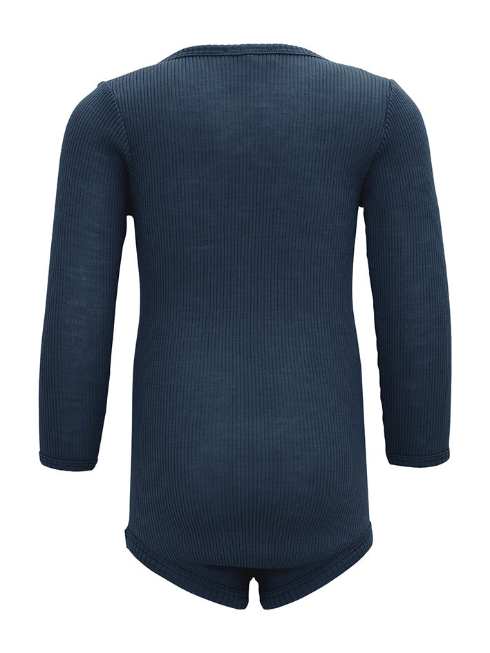 This bestselling long-sleeve Minimalisma Alaska rib Body in Midnight features a soft envelope neck for convenient dressing and nappy changes; whether pulled up or down. This body is crafted from soft merino Wool with self-fabric bindings around the leg-opening and three nickel-free YKK buttons for quick and easy outfit changes. Wool is naturally antibacterial, making it an excellent choice as a first layer for babies.
