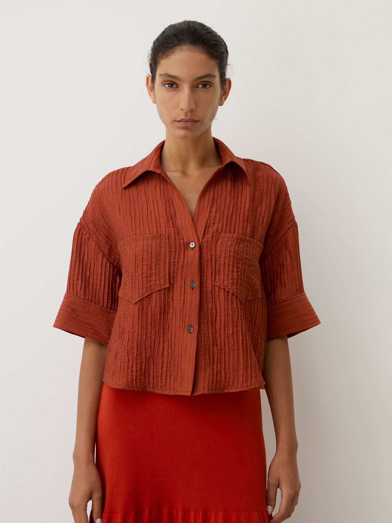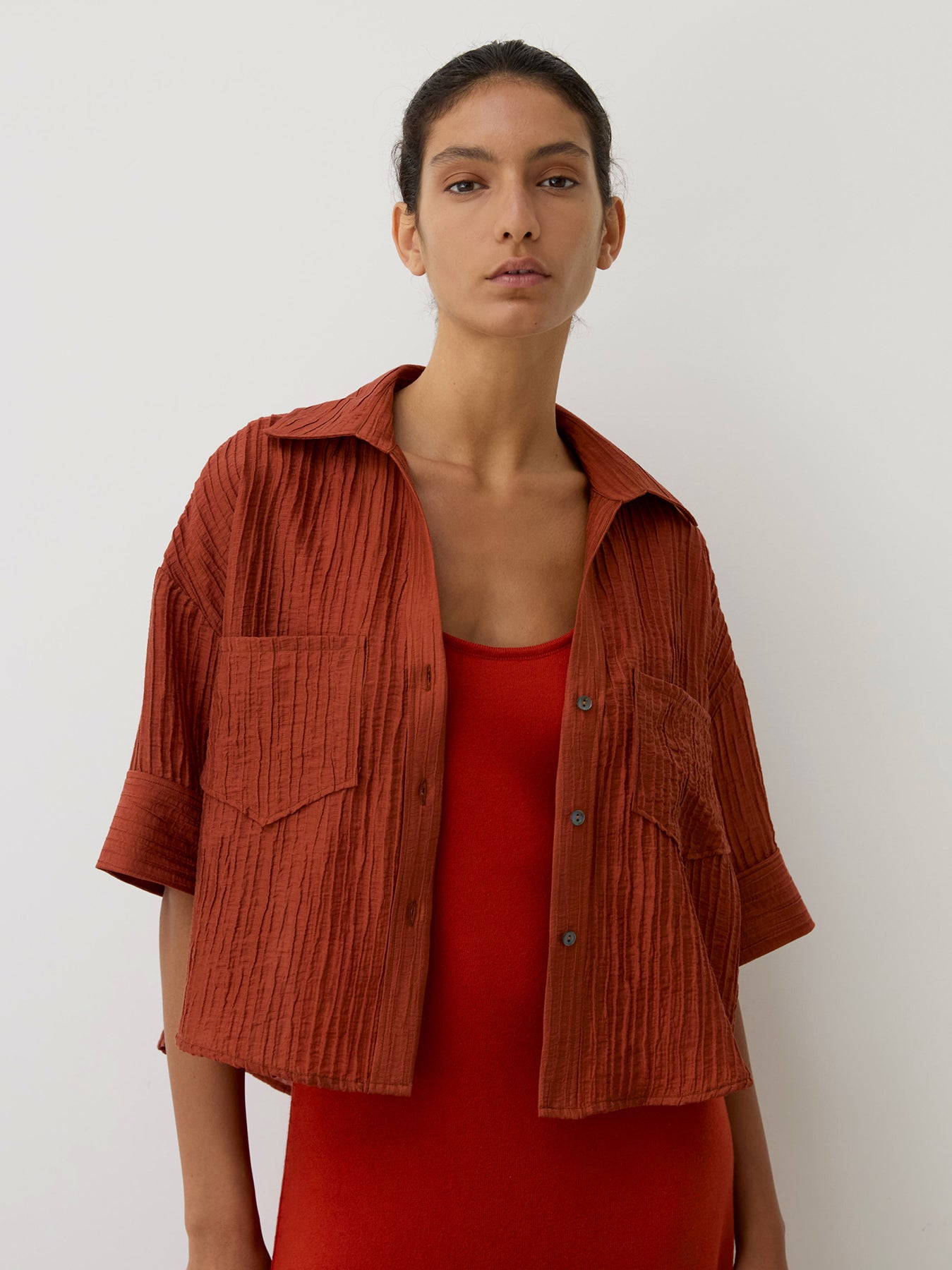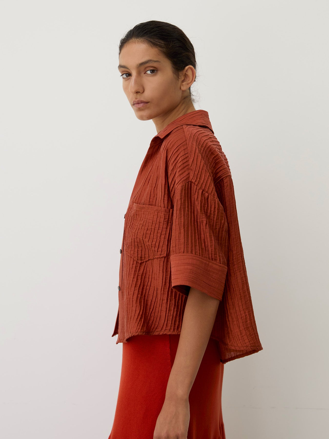 This cropped shirt is made from a soft, textured Lyocell blend with a bold wrinkle finish. It features short sleeves and front patch pockets. This relaxed style can be worn as an overshirt over a dress or on its own.