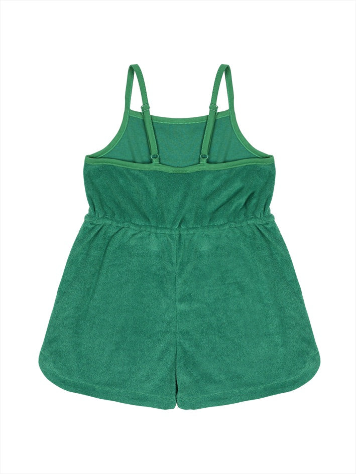The Jelly mallow Apples Sleeveless Overall in Green is made of 50% cotton, 50% polyester. Adjustable shoulder straps Made in China