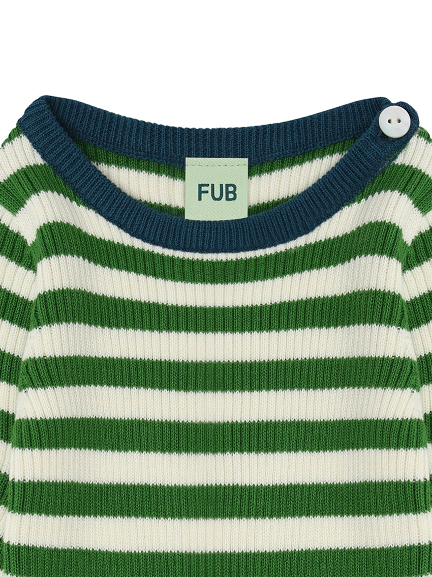 Knitted in a firm rib structure, this long-sleeved tee is a FUB classic. It has a straight slim fit and is detailed with a round rib trimmed neckline and clean self-edges at the sleeves and bottom hemline. This top has a practical button closure on the shoulder with pearl shell buttons and is available in a striped and a solid color version. Made from organic cotton.