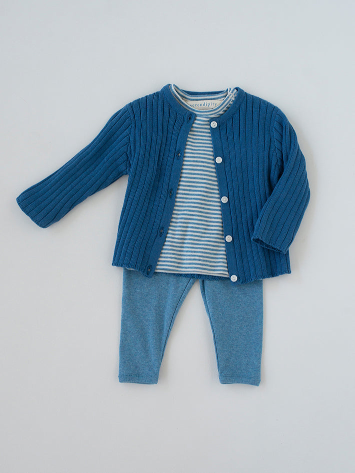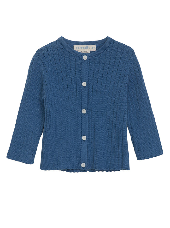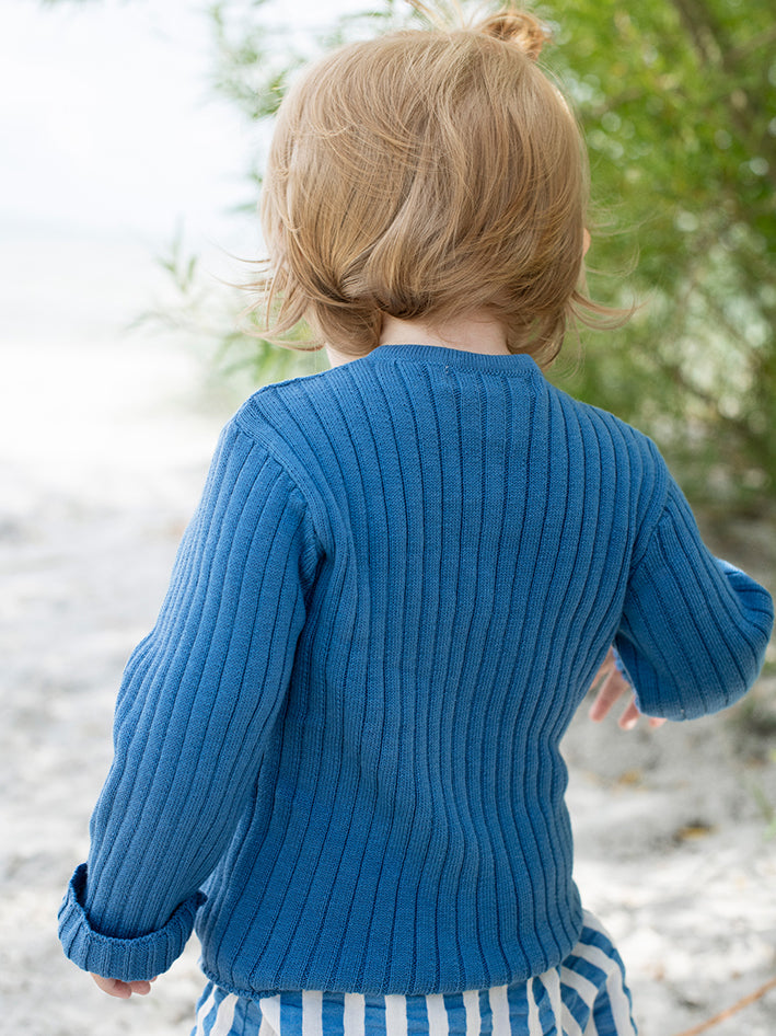 Cotton knit Baby Cardigan in Dark Tide blue by Serendipity. Design with wide rib knit, for slim fit and taguanut buttons in front. Soft in 100% organic cotton and full GOTS certification.