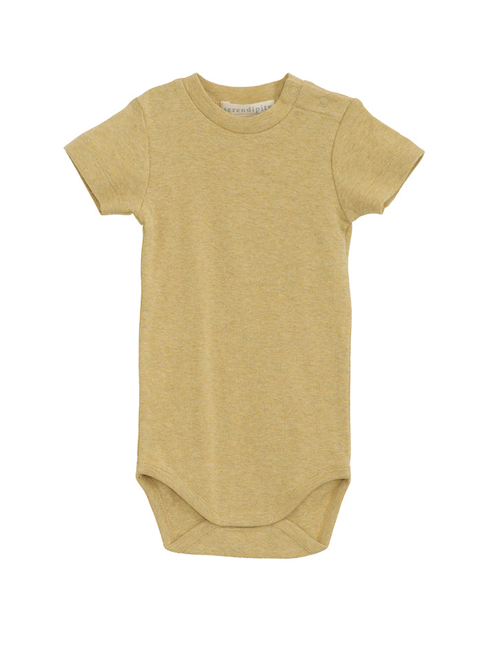 Chamomile Short Sleeve Baby Body by Serendipity in 100% organic cotton rib. Soft melange quality. Snap buttons on left shoulder and by legs for easy diaper change. Perfect for the organic children's wardrobe. All steps of the production are certified by GOTS.