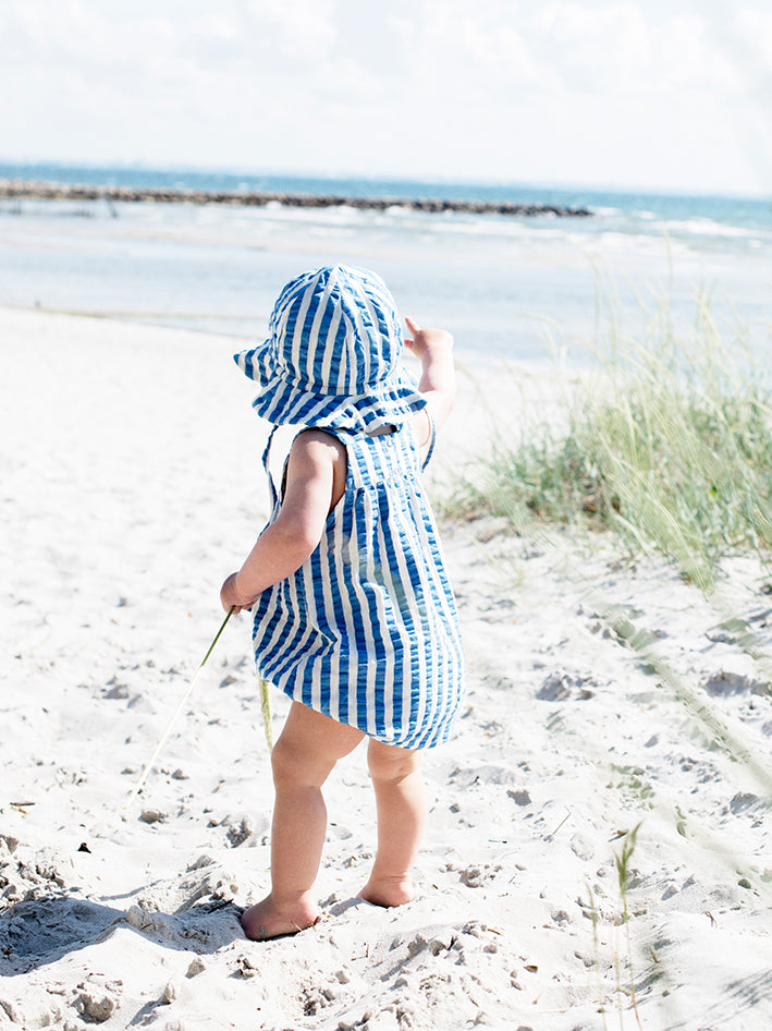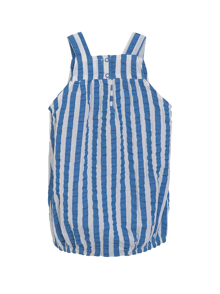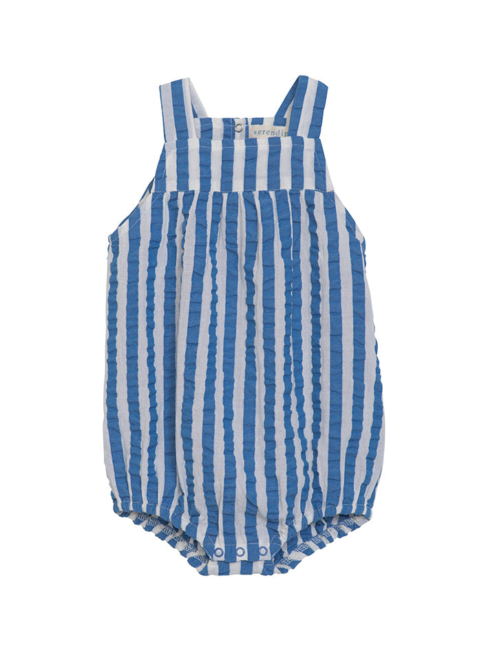 Light strap Romper in Striped seersucker in Bright Blue and white Stripes by Serendipity. Design with flat fit top piece front and back and lots of frills from top piece. Opens in the back with snap buttons. Leg opening has elastic and snaps for easy opening. 100% organic cotton and fully GOTS certified.