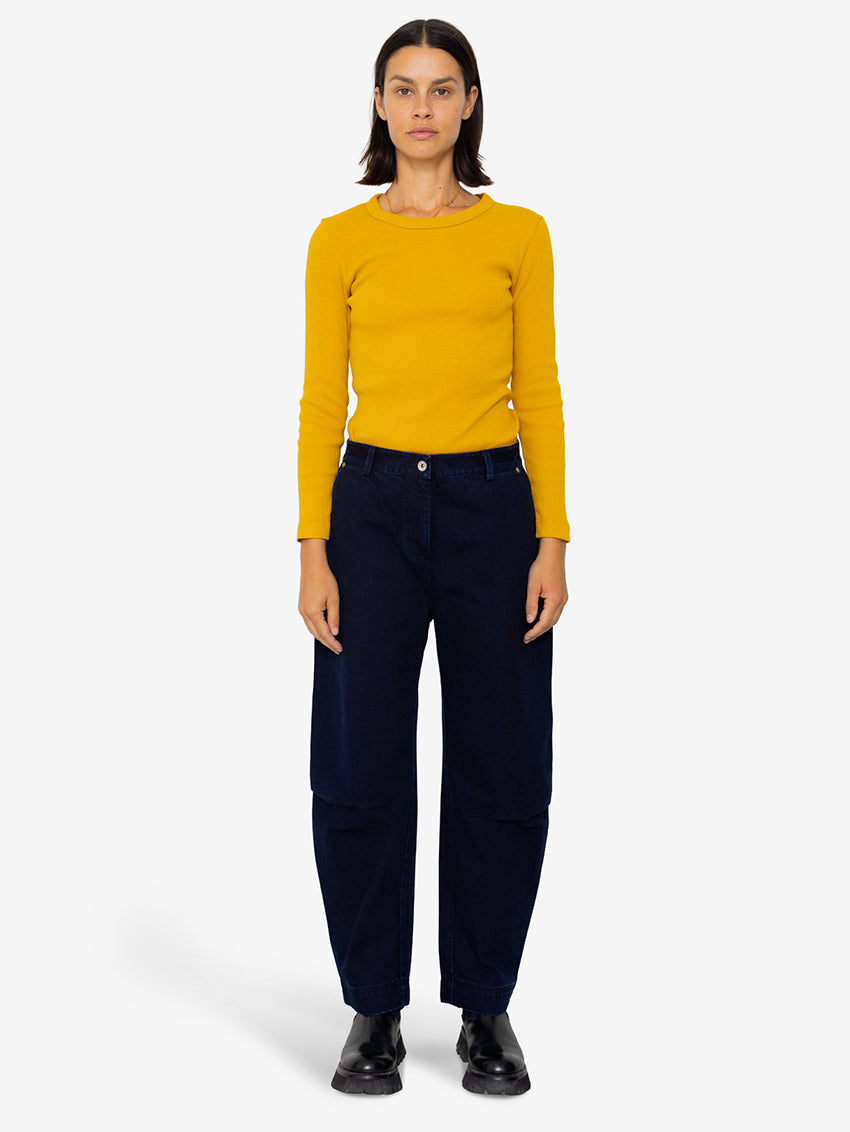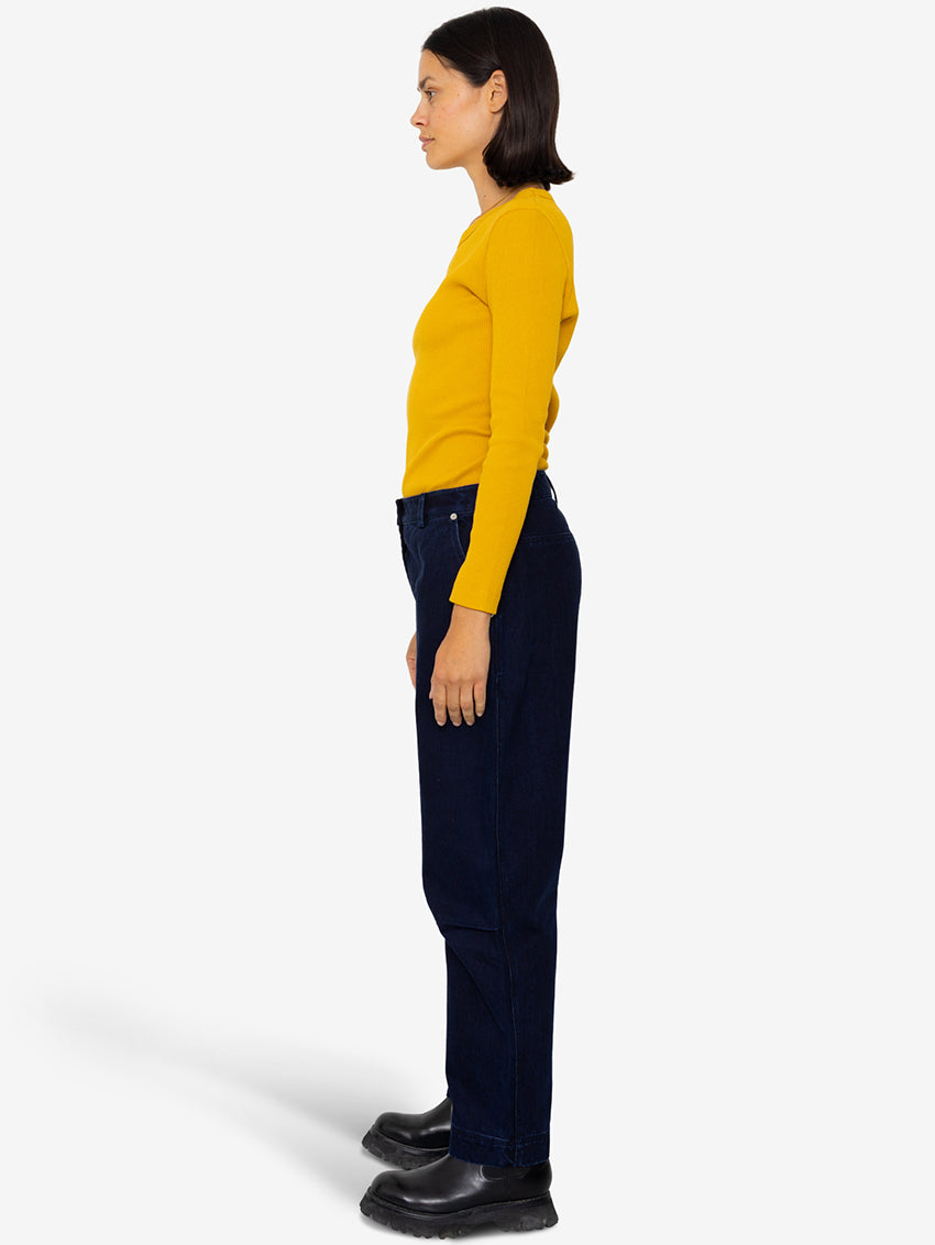 Named for its slightly curved, barrel-like shape, the Folk Barrel Trousers in Deep Indigo Slub boast a looser leg fit for a look that is both casual and refined.