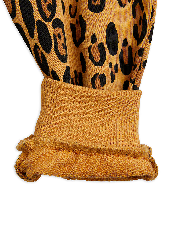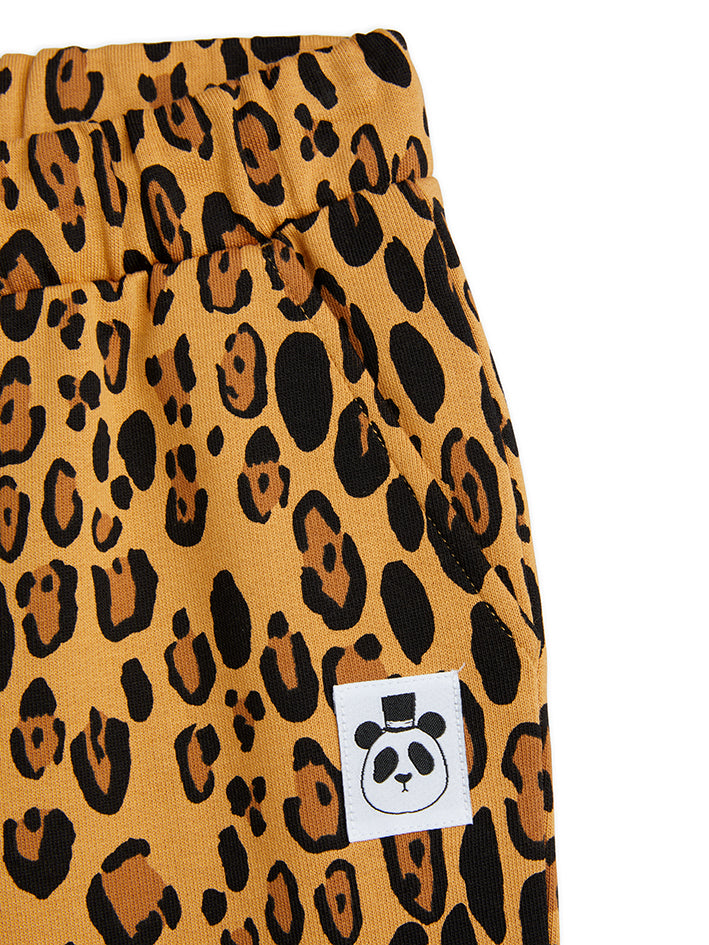 Beige Sweatpants featuring an all over Leopard print, made from 100 % GOTS certified organic cotton. The sweatpants are designed with a Mini Rodini Panda label on the left leg, ribbing at the waist and cuffs, two pockets as well as an elastic drawstring waist.