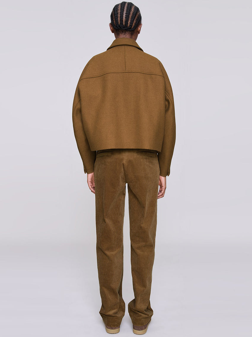 A cropped, boxy jacket with a loose fit, designed with a classic collar, sloping shoulders, and two side pockets. Finished with hidden faux horn buttons and a black lining for a clean, minimal look.