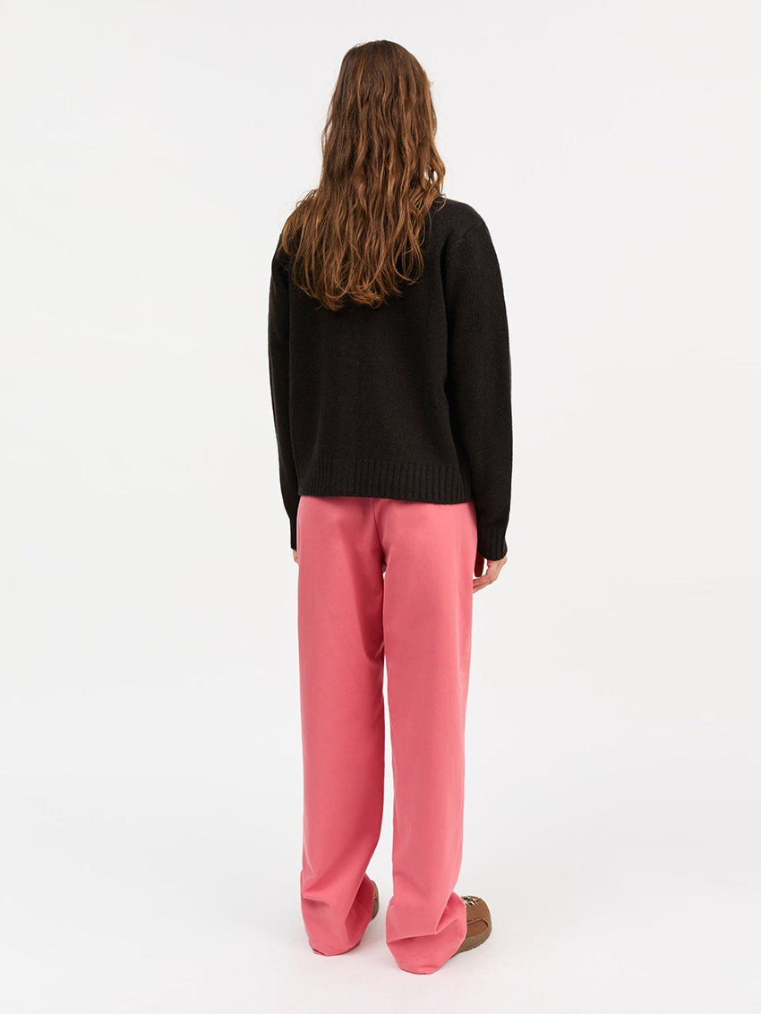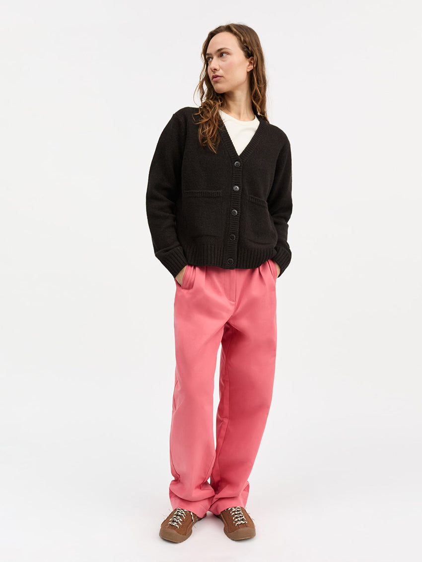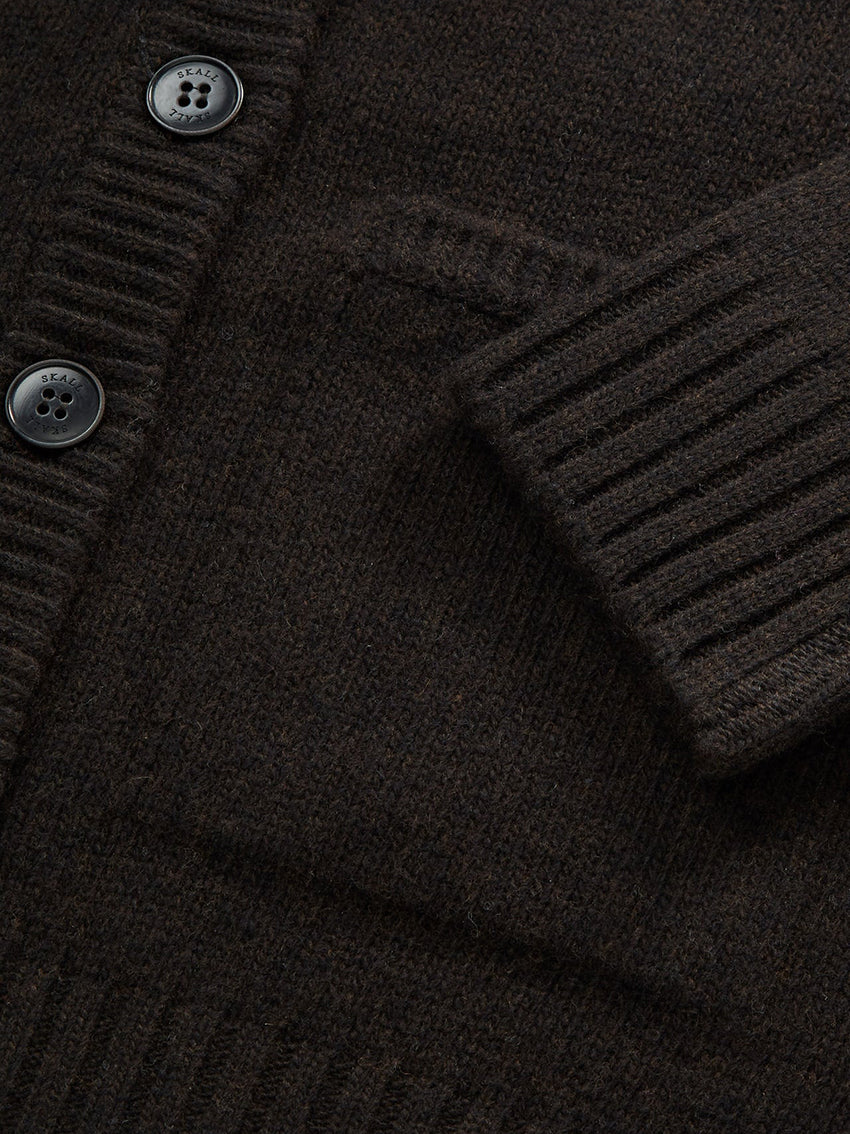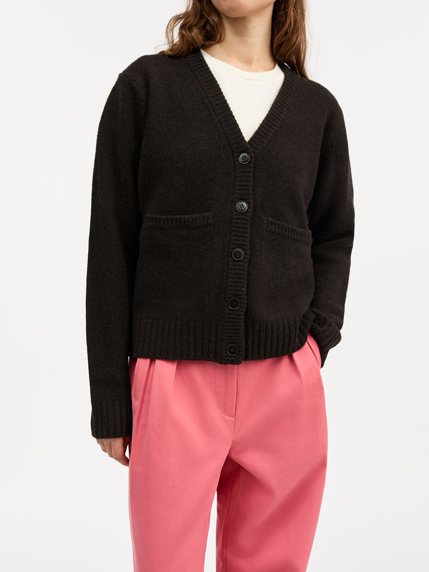 The Skall Studio Beti Cardigan in Deep Brown is made from 100% merino wool and has dropped shoulders and a classic V-neck that closes with five buttons. There is a rib finish on the neck, hem, cuffs and on the two patch pockets at the front. SIZE RECOMMENDATION Designed in a loose silhouette falling freely on the body. If you prefer it less loose, we recommend sizing down. The model is 177 cm tall and is wearing a size S FABRIC AND CARE • 100% merino wool • Handwash only • Produced in Italy