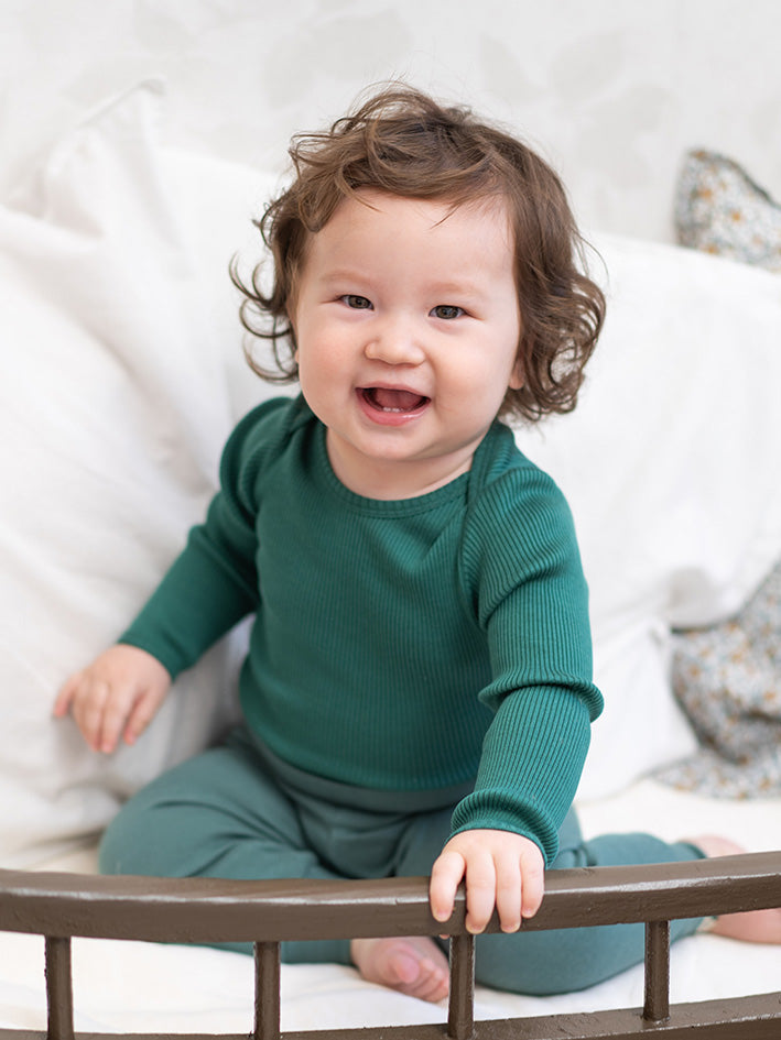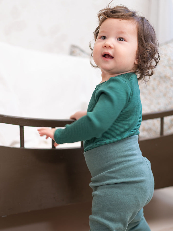 The seamless long-sleeve Minimalisma Bono Body in Emerald is crafted in a soft silk-cotton blend. The body features an envelope neck opening and YKK nickel-free snap buttons for easy dressing and convenience. Silk is known for its hypoallergenic properties and gentle touch against the skin. This, combined with the seamless construction of the garment, makes this body an excellent choice for kids with sensitive skin. Quality: 70% Silk, 30% Cotton