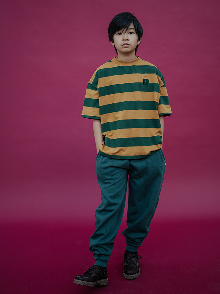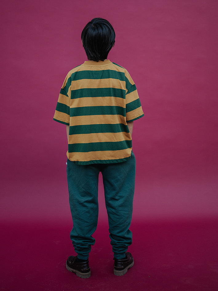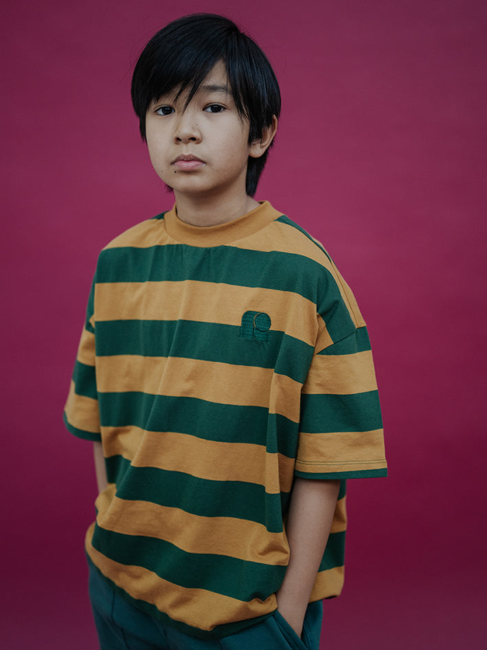 Designed for a relaxed and oversized fit, it features a bold horizontal yarn dyed stripe in sophisticated gold and deep country green, short sleeves, and a classic crew neckline for effortless styling.