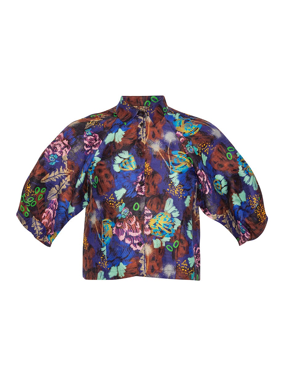 This colorful shirt features a playful chicken and space-inspired print, 3/4-length raglan sleeves, a classic collar, front button closure, and a straight hem for a relaxed, versatile fit.