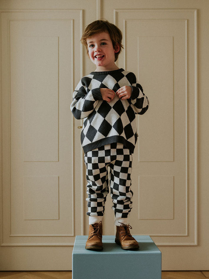 The playful checkered pattern adds a stylish touch, while the flexible knit makes them easy to wear and move in. Perfectly paired with Yuki’s knitted sweaters for a cozy, coordinated look.