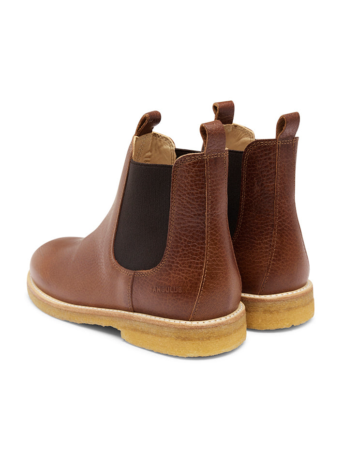 Classic Angulus Chelsea Boots in Medium Brown with elastic. Solid heel cap for maximum support. Soft and flexible crepe rubber sole. Produced in Portugal and lined with 100% chrome-free leather.