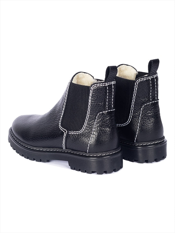 Angulus Chelsea Boot Tracksole in Black leather with soft Wool Lining and contrast stitching. The boot features a round toe, functional elasticated sides and heel strap for easy on and off, a breathable and chrome-free wool lining, a fixed heel counter for extra comfort and support, and a light rubber sole with a track pattern. Crafted in natural and breathable leather. Designed in Denmark and handcrafted with love in Portugal. Always measure your child's foot before buying to ensure you get the right size. We recommend a growth allowance of 1-1.5 cm.