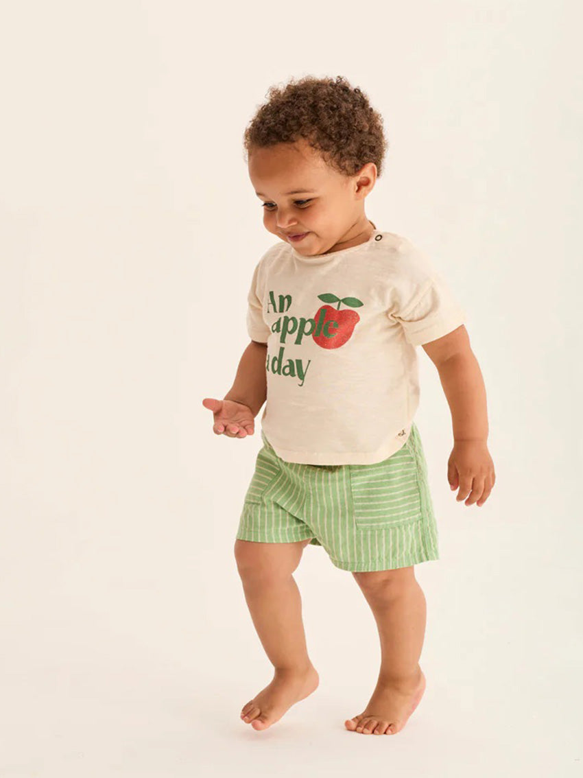 Baby and toddler striped shorts made from cotton fabric with a linen-like texture. They feature an elastic waistband with a decorative drawstring and front patch pockets with horizontal stripes for a comfortable, classic look.