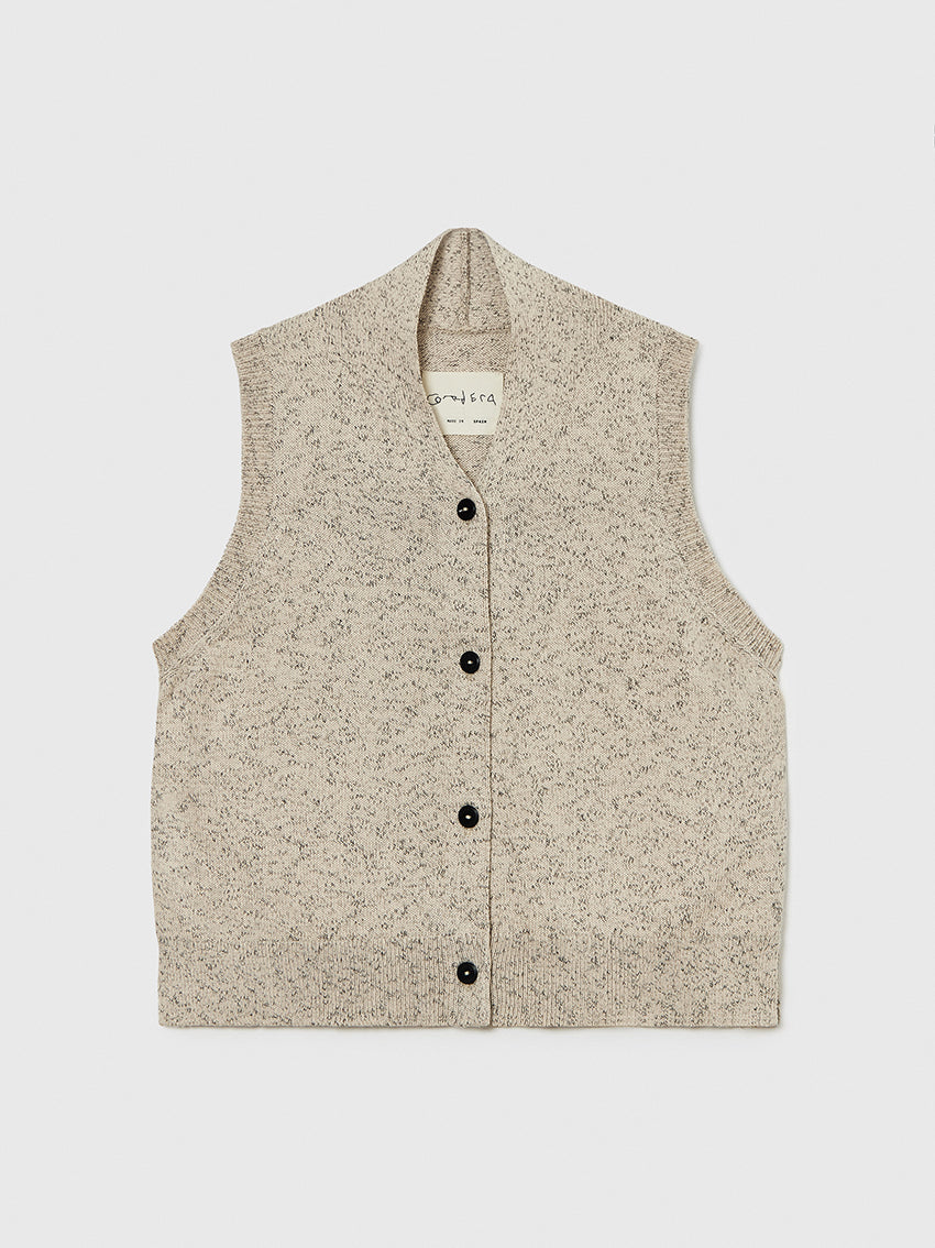Detailed with a v-neck and front button fastening, the Flecked Cotton Vest in Natural features a high neckline at the back for added style.