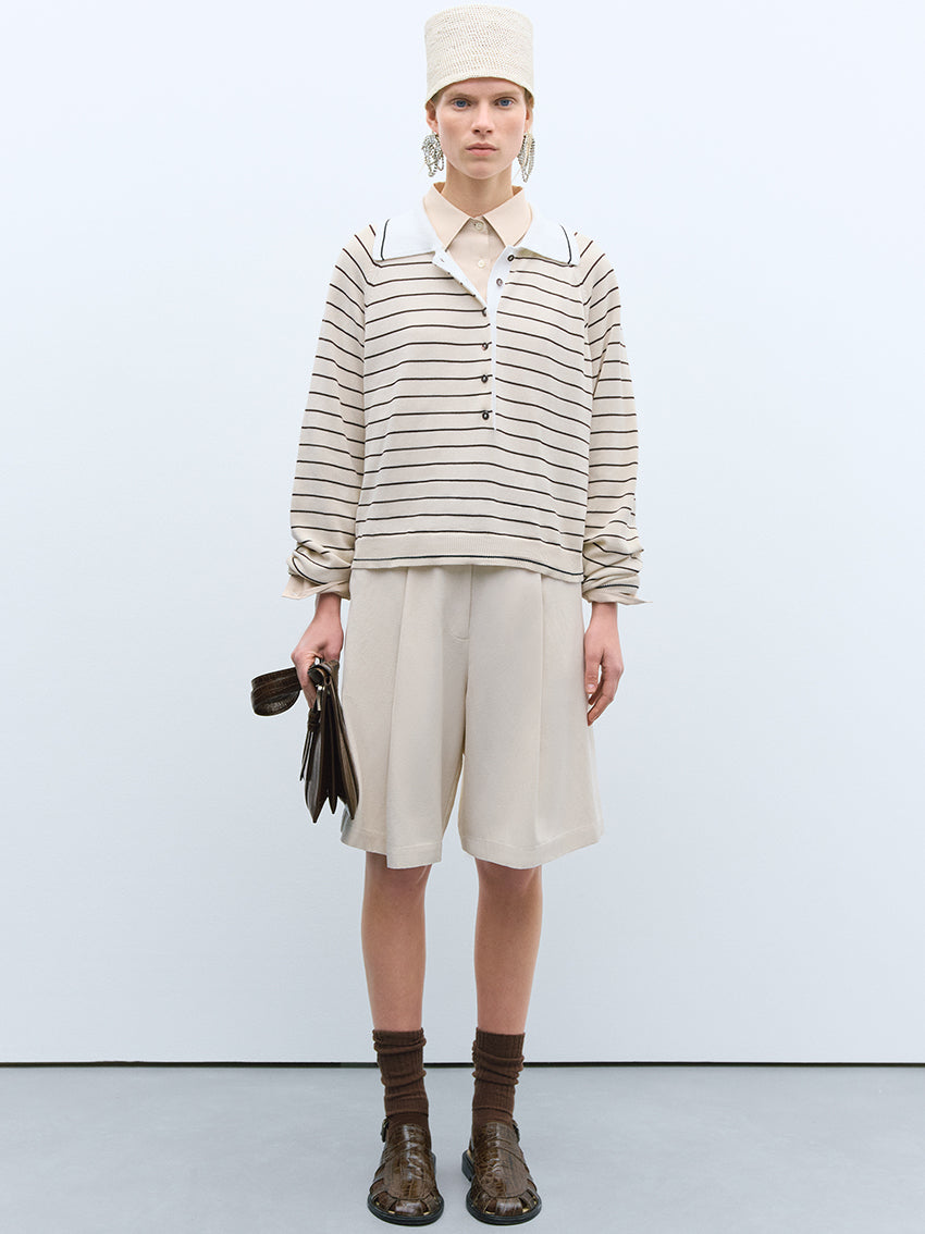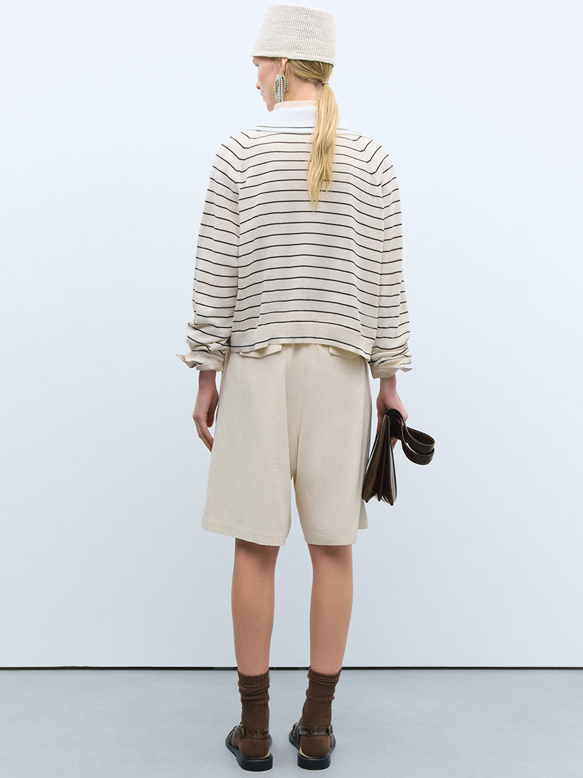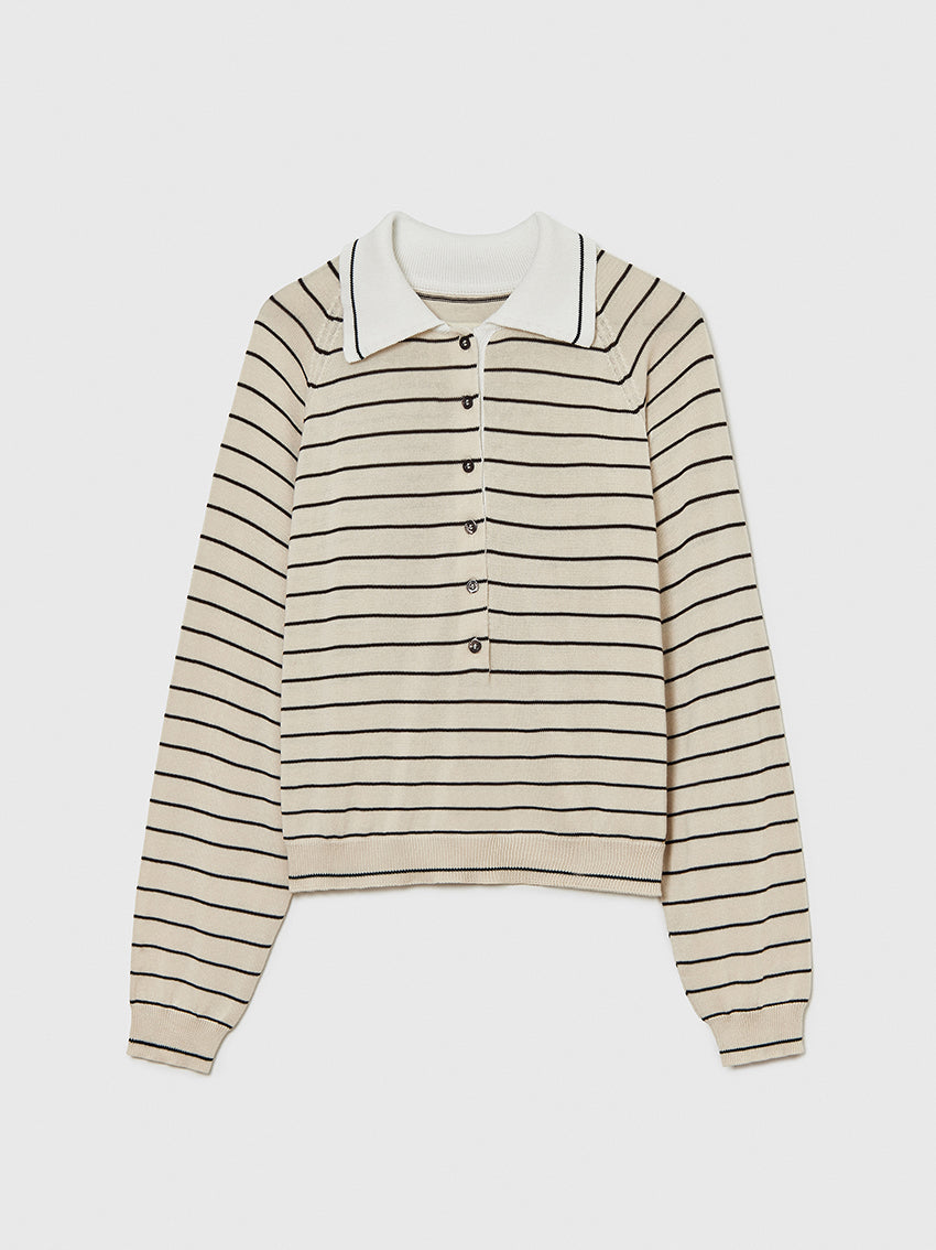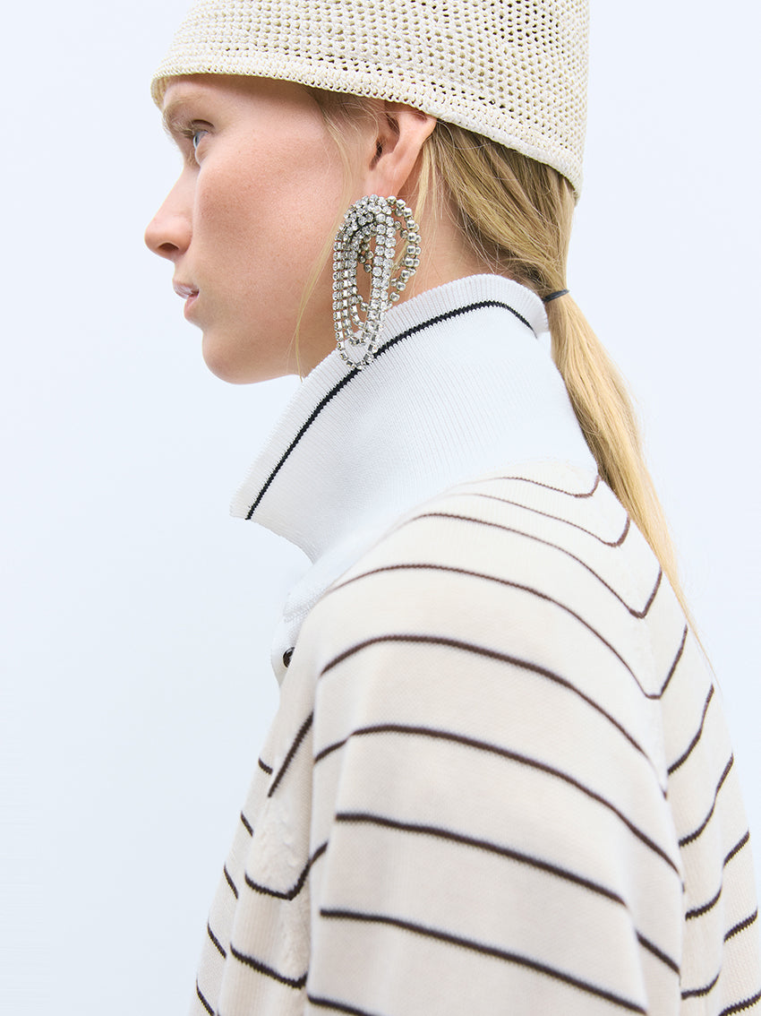 Features brown stripes on an ecru background, accented with a contrasting white collar and black stripe detail that matches the striped cuffs.