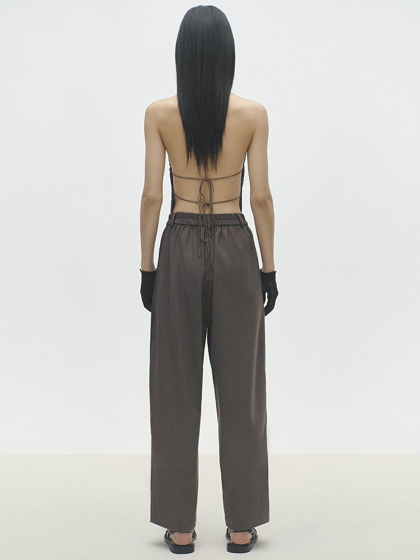This wide-leg style features side pockets, belt loops, and side pleats.