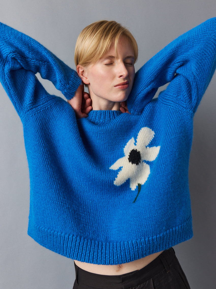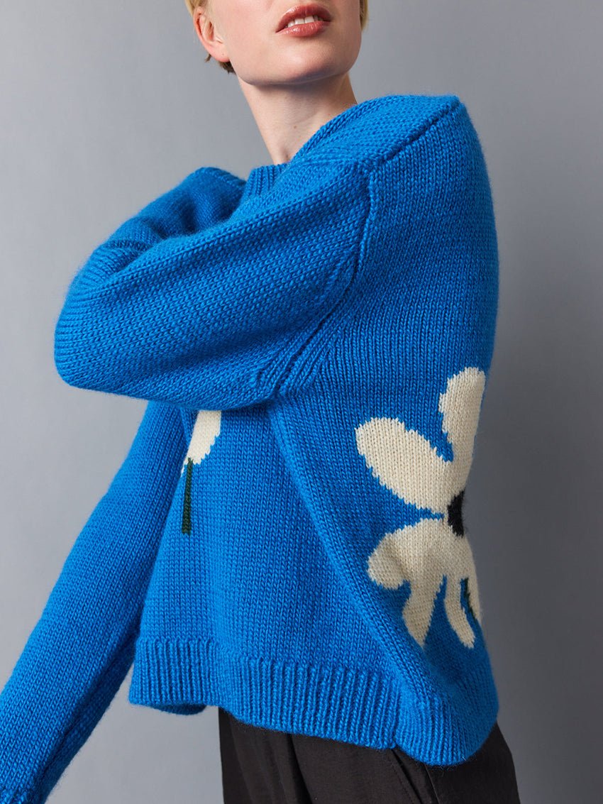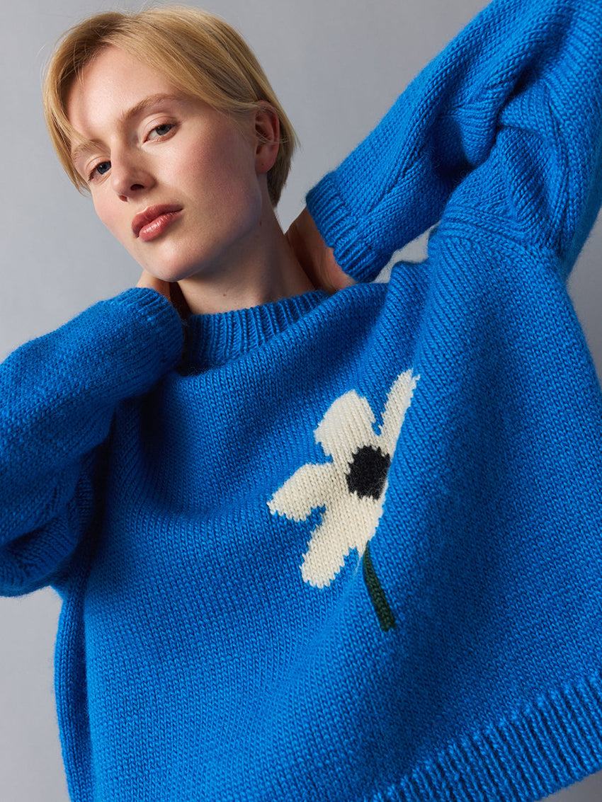 This loose-fit sweater in beautiful blue features a custom daisy motif in white and black, crafted in jacquard knit.