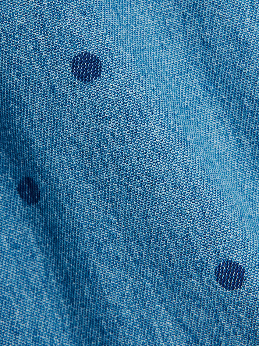 Sun hat made from 100% organic cotton denim with a dots print. Designed with a wide brim for sun coverage, chin ties for a secure fit, and Mini Rodini embroidery at the brim.