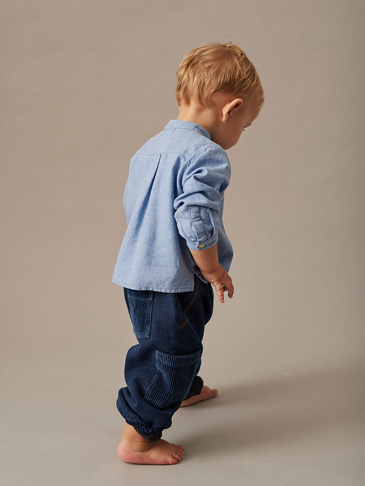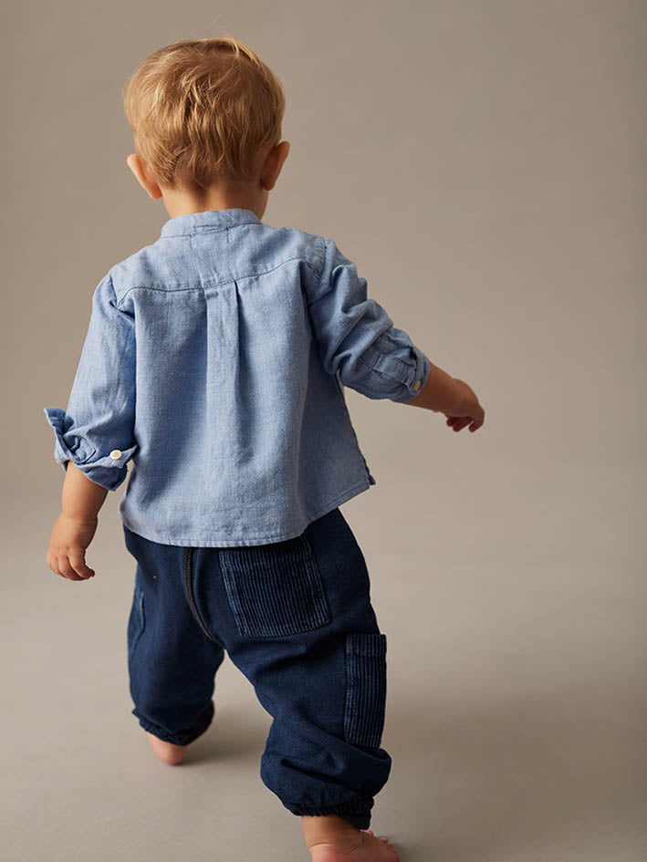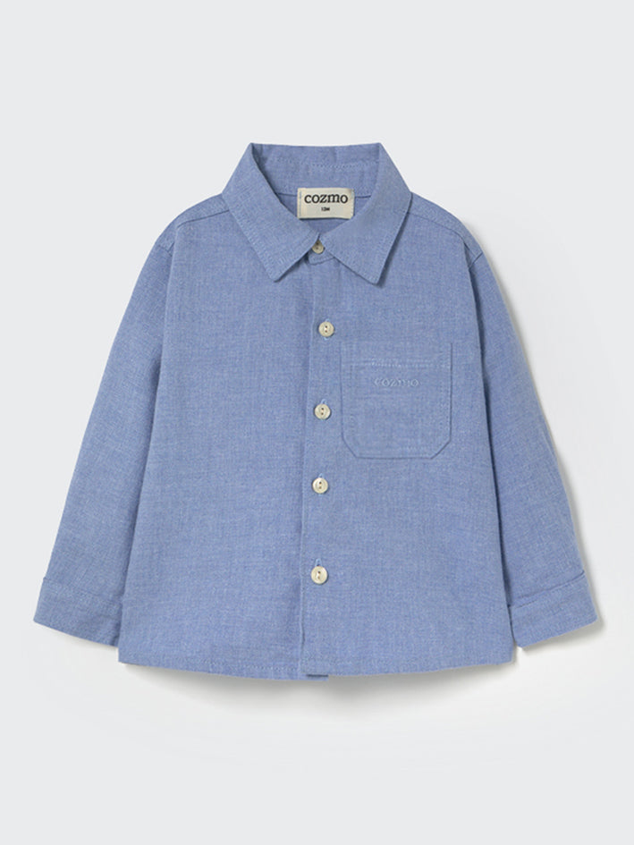 This Dublin Chambray Baby Shirt by My Little Cozmo is made from cotton Flannel with a mélange effect, crafted from 100% sustainable cotton. It features a classic collar, a button-down front placket, and a chest patch pocket with “Cozmo” embroidered on it. Buttoned cuffs offer a secure fit. Fully lined with a soft brushed knit for added warmth and comfort. Made from cotton certified by the Better Cotton Initiative. Offers a unique, handcrafted look. A sustainable choice for your baby’s wardrobe. 100% cotton. Woven