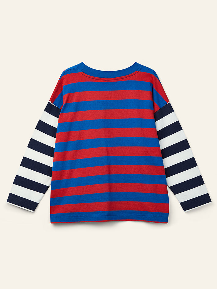 Duo Stripe Tee in Ladybird Red and Slow Blue by Wynken. This long-sleeved t-shirt is made from lightweight, breathable certified, 100% organic cotton—perfect for all-day comfort. With its relaxed fit, dropped shoulders, and bold all-over stripes, it’s unmistakably Wynken. 100% Organic Cotton. Made in Portugal.
