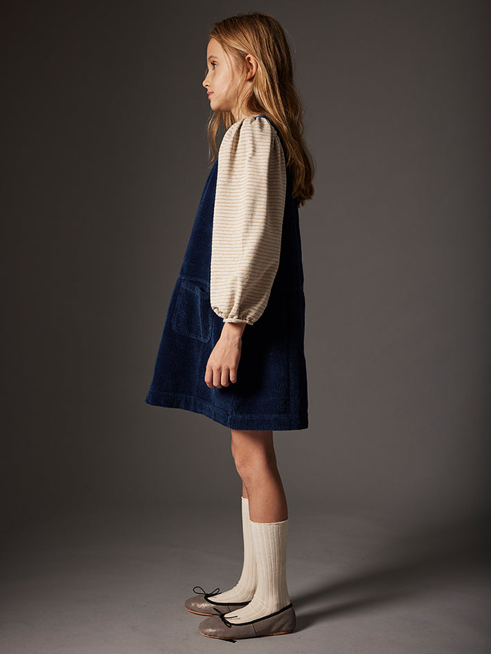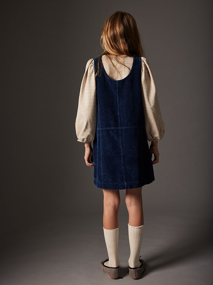 Add this chic My Little Cozmo Corduroy pinafore overall Dress in Denim to your daughter's dress. The fabric is pure organic cotton, offering unparalleled comfort and breathability every time she wears it. Its versatile design blends elegance and casual style, making it perfect for any occasion. An essential addition, this dress merges classic appeal with softness. Features Seams at the waist, front, and back. Faux flap pockets at front. Lined with contrasting fabric. 100% ORGANIC COTTON WOVEN