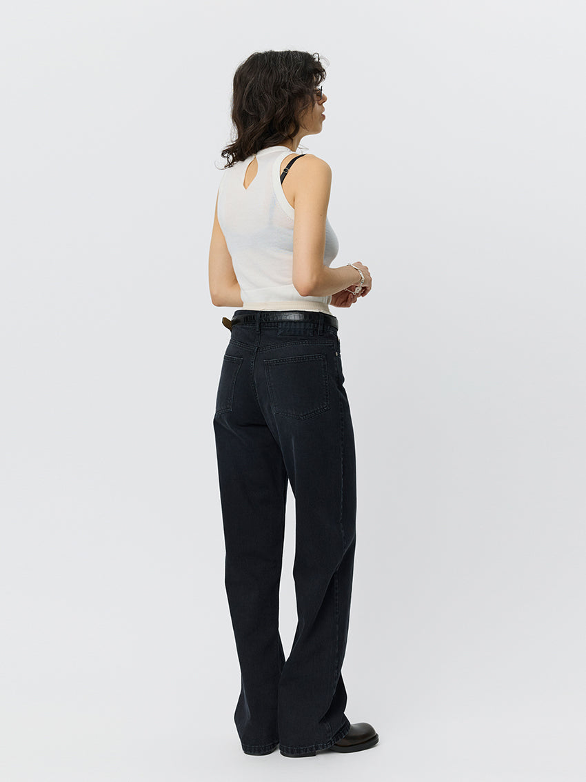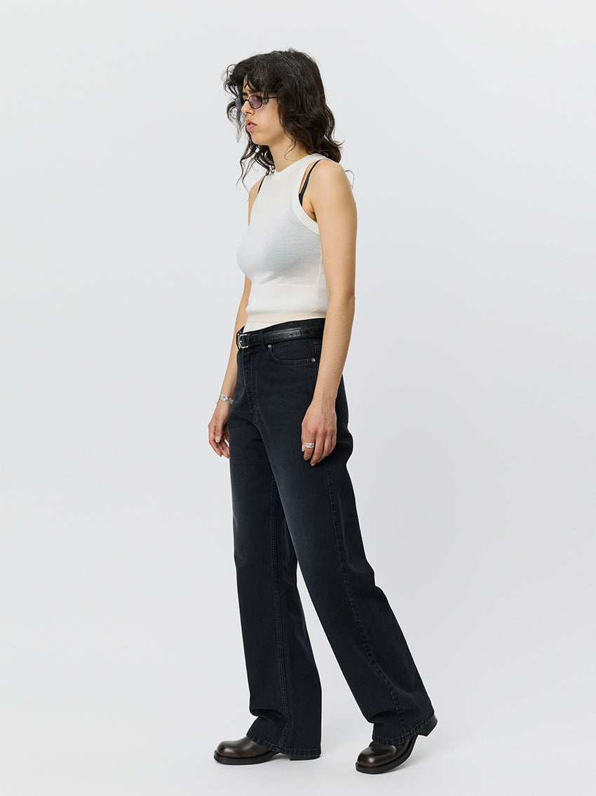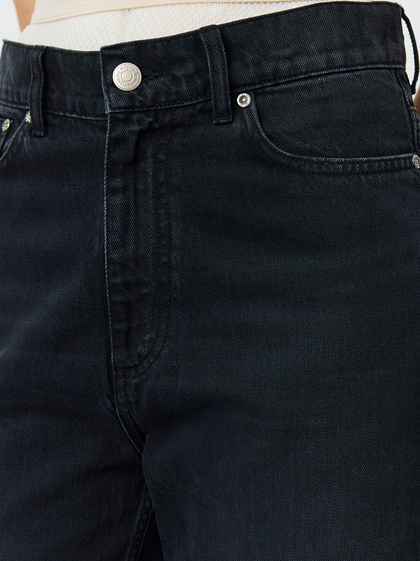 The Frequent Jeans has a relaxed regular fit with a mid-rise. Made with side pockets, rear patch pockets, metal button closure and YKK zip fly. Cut from a garment washed organic cotton denim with a dry feel in faded black.