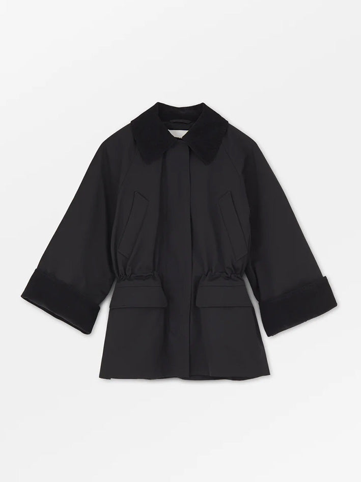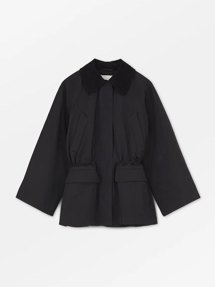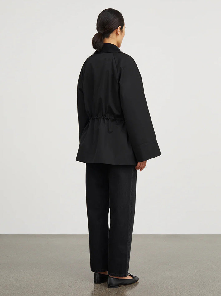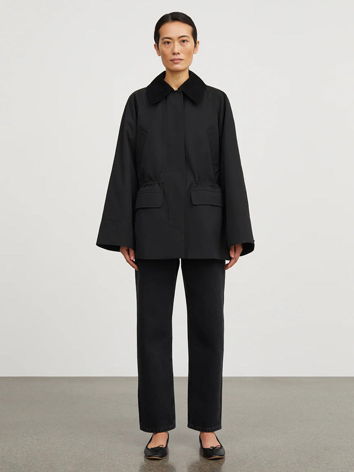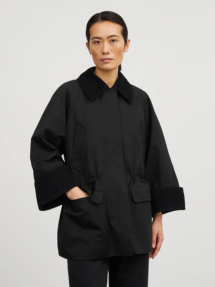 The Gaby Jacket in Black from Skall Studio is made in a water repellant organic cotton. The jacket has an oversize fit with an adjustable elastic drawstring in the waist and is inspired by the English country style. It is designed with a round neck opening and a hidden placket with push buttons and closes with a zipper. It has four pockets on the front, one pocket inside and a quilted lining. The wide raglan sleeves has corduroy details on the inside of the cuffs. The same corduroy details adorn the collar and the inside of the pockets. SIZE RECOMMENDATION Relaxed fit offering freedom to move effortlessly. Designed in a loose silhouette falling freely on the body. If you prefer it less loose, we recommend sizing down. The model is 177 cm tall and is wearing a size 36. FABRIC AND CARE • Outer and lining: 100% organic cotton • Padding: 100% polyester • Dry clean only • Produced in Bulgaria