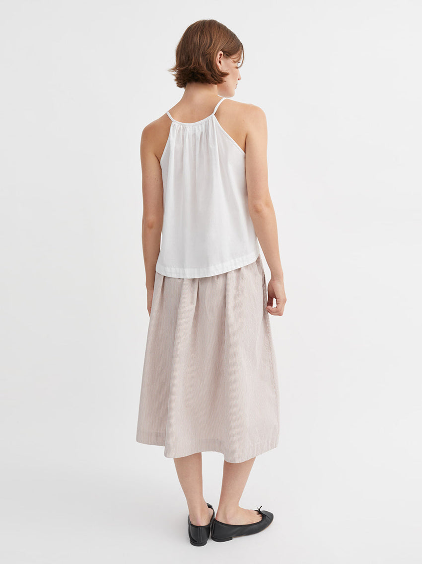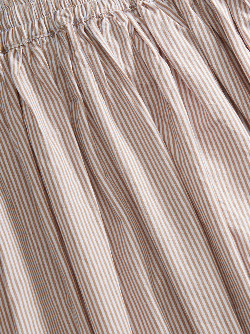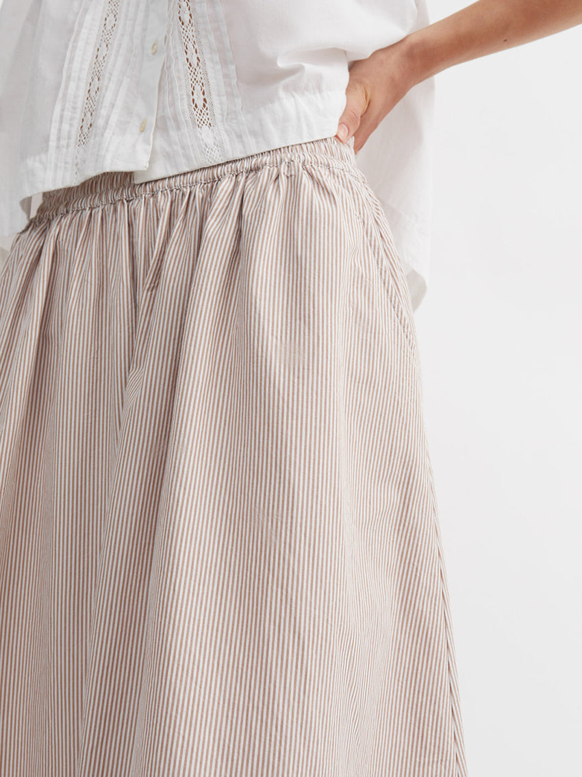 The Skall Studio Ginny Skirt in Warm Beige White Stripe is a shorter, wide skirt made from organic cotton. The skirt has an elastic waistband and side pockets. SIZE RECOMMENDATION Relaxed fit offering freedom to move effortlessly. Designed in a loose silhouette falling freely on the body. The model is 176 cm tall and is wearing a size 36. FABRIC AND CARE • 100% organic cotton • GOTS certified • Machine wash at max. 30 degrees • Produced in India