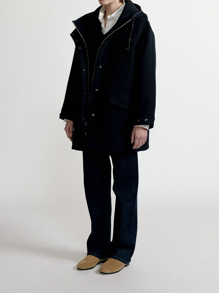 The half-length Hanson Hoodie Parka in Dark Navy features a three-dimensional round shoulder design and boasts a sophisticated silhouette.