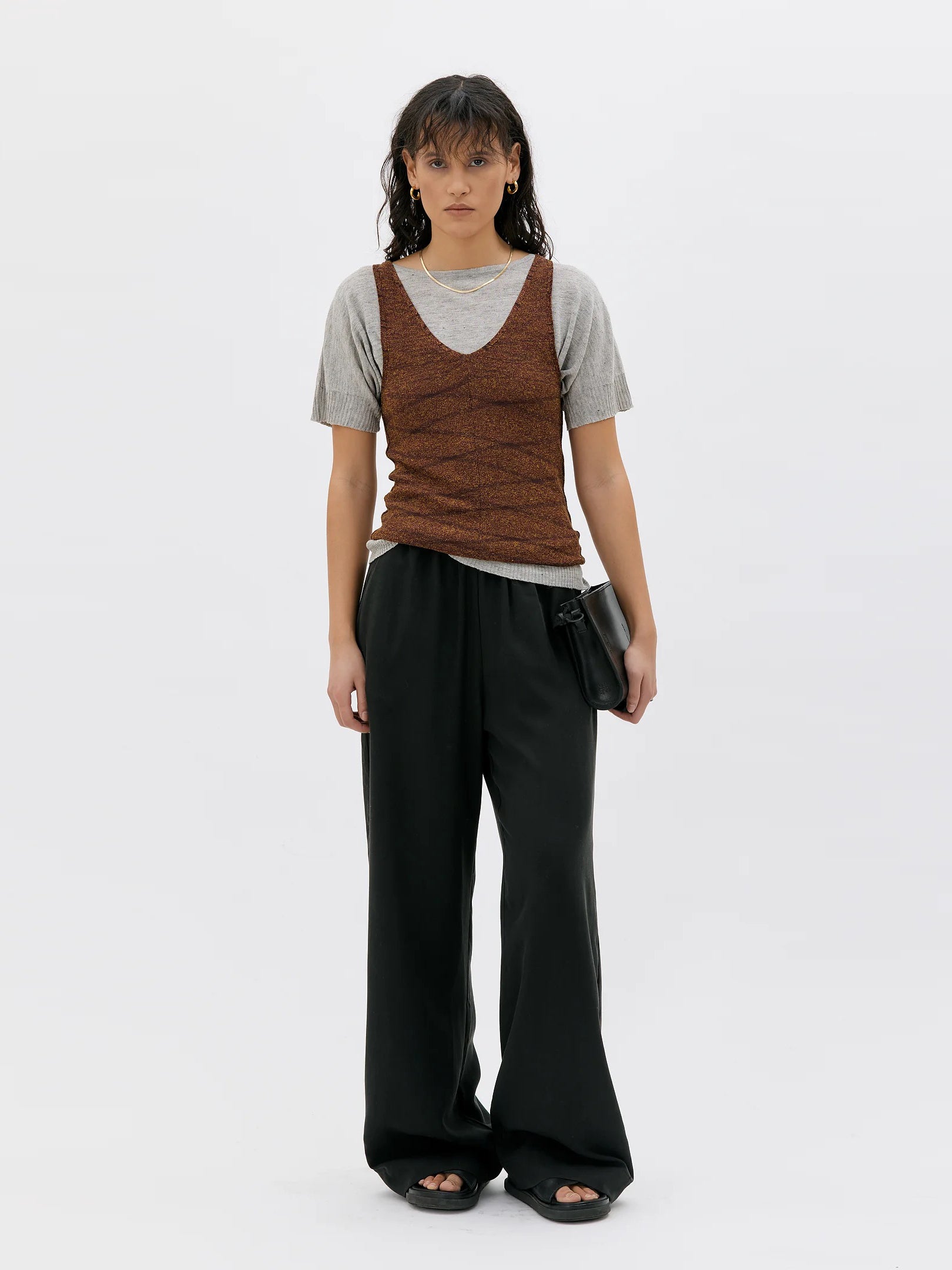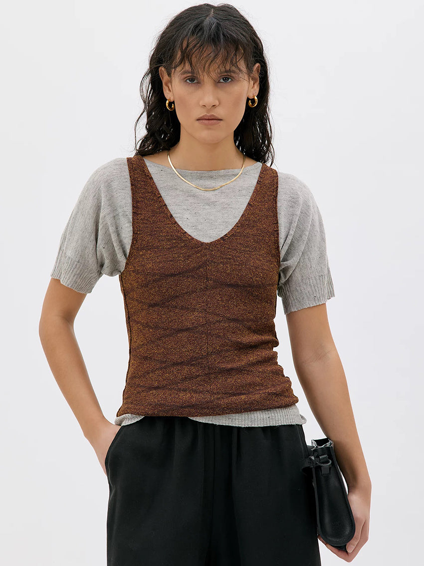 This knitted Hira Space Dyed Tank Top in Morel Brown by Maska is a true standout, crafted with a yarn that combines a unique construction and colour combination for a soft marbled effect. With a fresh hand feel and subtle lustre, achieved through a blend of top-quality linen, organic cotton, and recycled polyester, this top exudes effortless style and sustainability. This style features a heart shaped v-neck and a close-to-the-body fit. Composition: 13% Linen, 20% Organic cotton, 67% Recycled Polyester GRS. Made in Nepal
