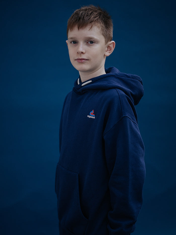 The Repose Ams Hoodie Cosmic Navy is crafted from soft organic cotton feece and features a hood with a comfortable kangaroo pocket.