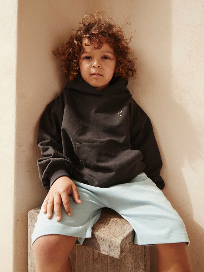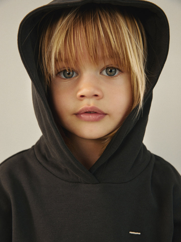 This long- sleeved Gray Label Hoodie in Pirate Black with kangeroo pocket at the front is made from our soft organic cotton fleece. It has an oversized fit, dropped shoulders and ribbed cuffs and hem. 100% Organic Cotton Fleece Produced in Turkey