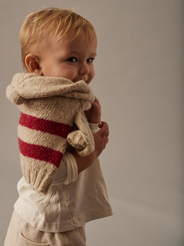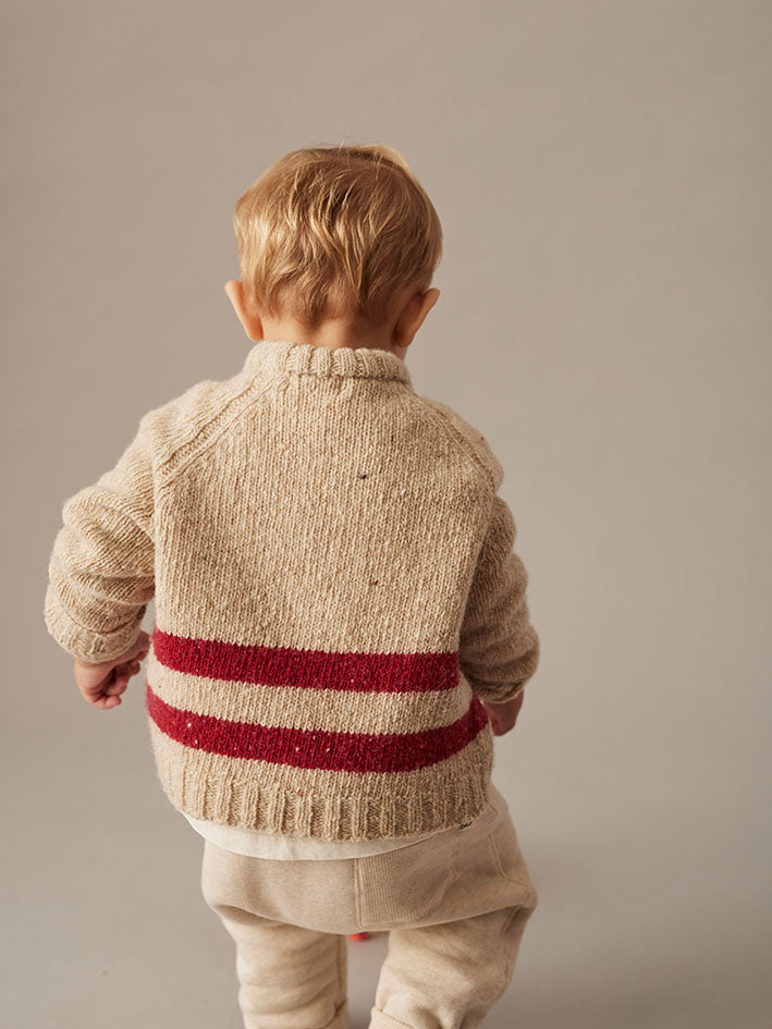 Idaho Baby Knit Sweater in Stone and Red by My Little Cozmo crafted from a soft, fluffy blend of wool and recycled polyamide tricot. It features ribbed neck, cuffs, and hem, raglan sleeves with cable-knit seams, and double stripes at the lower section. Subtly speckled texture for added depth. Warm and cozy, perfect for babies. Part of our recycled baby clothes collection. Made from a wool and recycled polyamide blend. Breathable and cozy—perfect for fall and winter wear. Comfortable fit with a naturally warm feel. Keeps baby warm without overheating. Kind to delicate skin. 80% wool, 20% recycled polyamide. Knit
