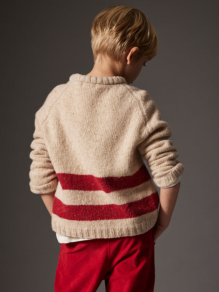 This My Little Cozmo Idaho Knit Sweater in Stone and Red is made from a soft, fluffy, and warm wool and recycled polyamide tricot blend. It features ribbing at the neck, cuffs, and hem. It also has raglan sleeves with cable-knit seams and double stripes at the lower section. Subtly speckled. Made from a wool and recycled polyamide blend. Breathable and cozy—perfect for fall and winter wear. Comfortable fit with a naturally warm feel. Keeps baby warm without overheating. Kind to delicate skin. 80% wool, 20% recycled polyamide. Knit