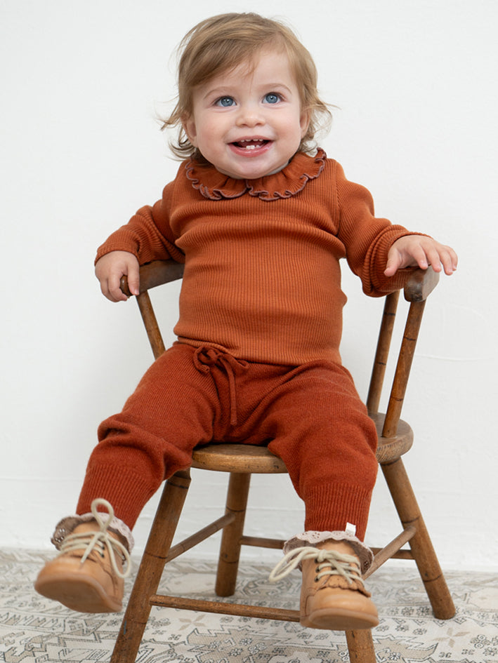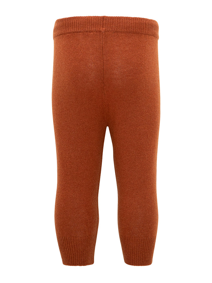 Beautifully soft and made in a light to medium-weight thickness. These warm and cosy Itty Trousers in Dark Rust by Minimalisma for baby girls and boys have a stretchy waistband with a drawstring and logo appliqué at the cuff. Sustainably crafted of Oeko-Tex Standard 100 yarn in 10% Cashmere and 90% Wool.