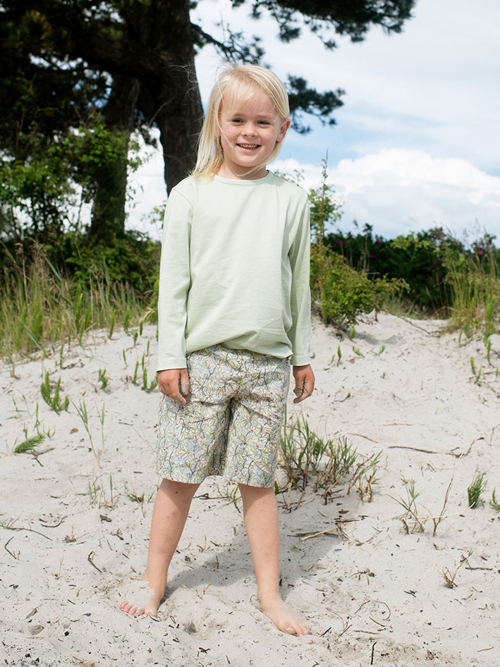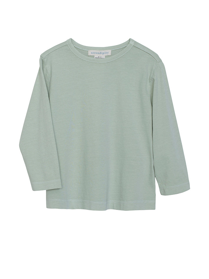 Long Sleeved Jersey t-shirt by Serendipity with a loose fit. Soft Aloe green jersey- Garment dyed with a natural dye where 80% is waste from Tea production, and the fabric is 100% organic cotton jersey. GOTS certified production. Variations of colour and a slightly used look on the seams are characteristics of garment dying.