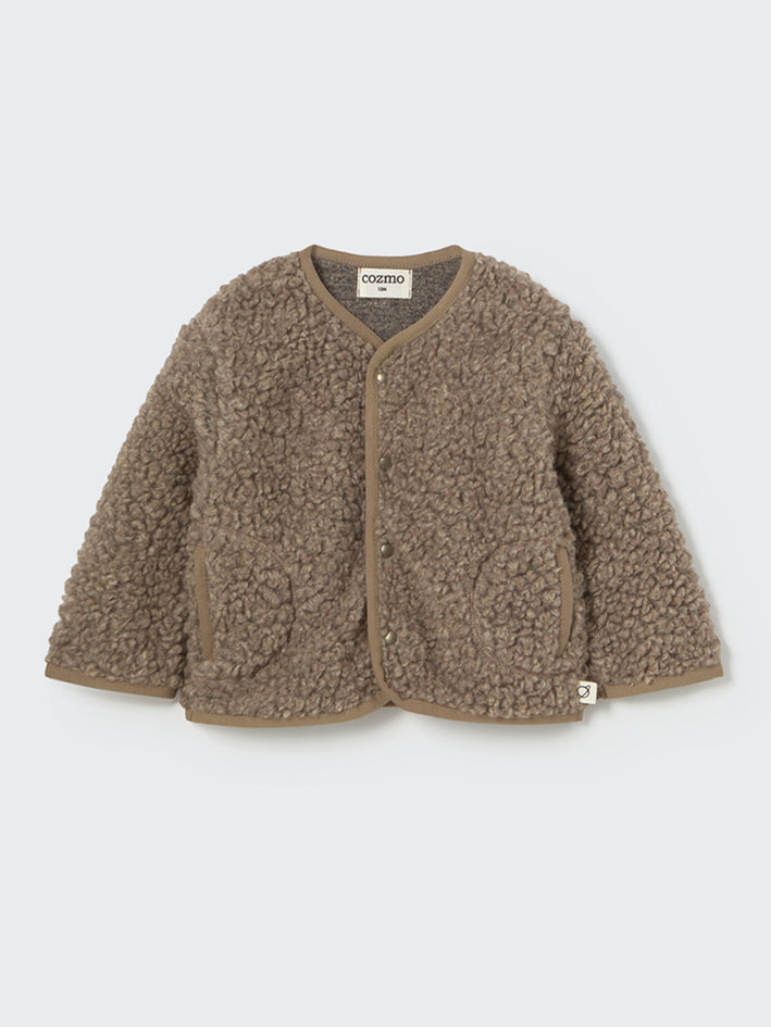 This Kyoto Baby Jacket in Taupe by My Little Cozmo is made from super warm sherpa knit virgin wool, featuring a plush and cozy texture. It has a mélange effect, a round neckline, snap buttons at the front, and two slit pockets at the sides. The jacket is piped with contrasting fabric for added detail and comfort. Made from virgin wool. Exceptionally insulating yet breathable. Lightweight warmth. Soft structure. Keeps baby warm without overheating. 40% wool, 30% polyester, 30% acrylic. Knit