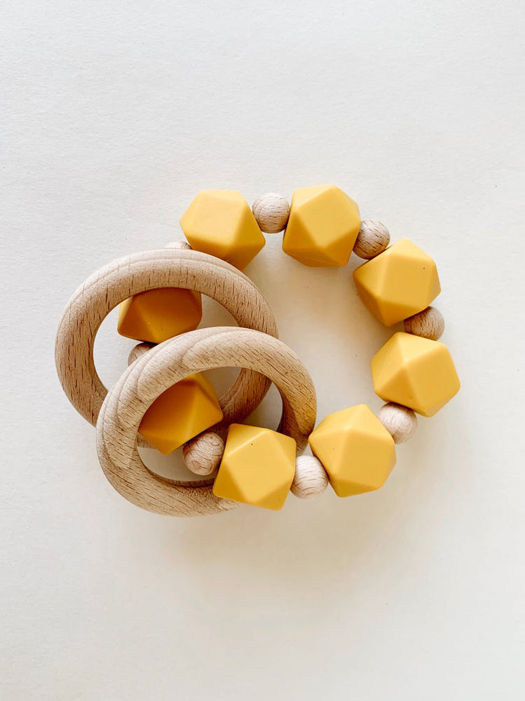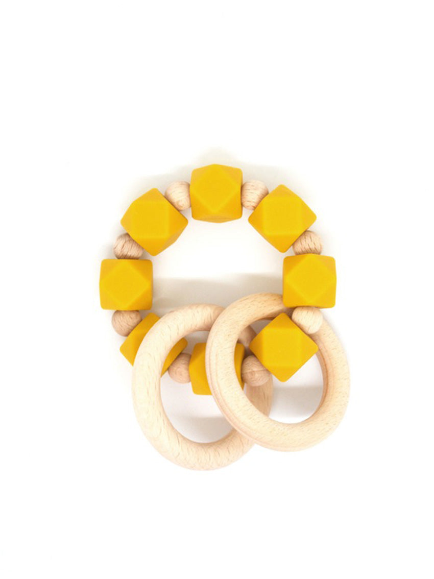 Two untreated wood rings move freely around the circle of BPA free silicone beads creating a soft rattle when baby shakes.