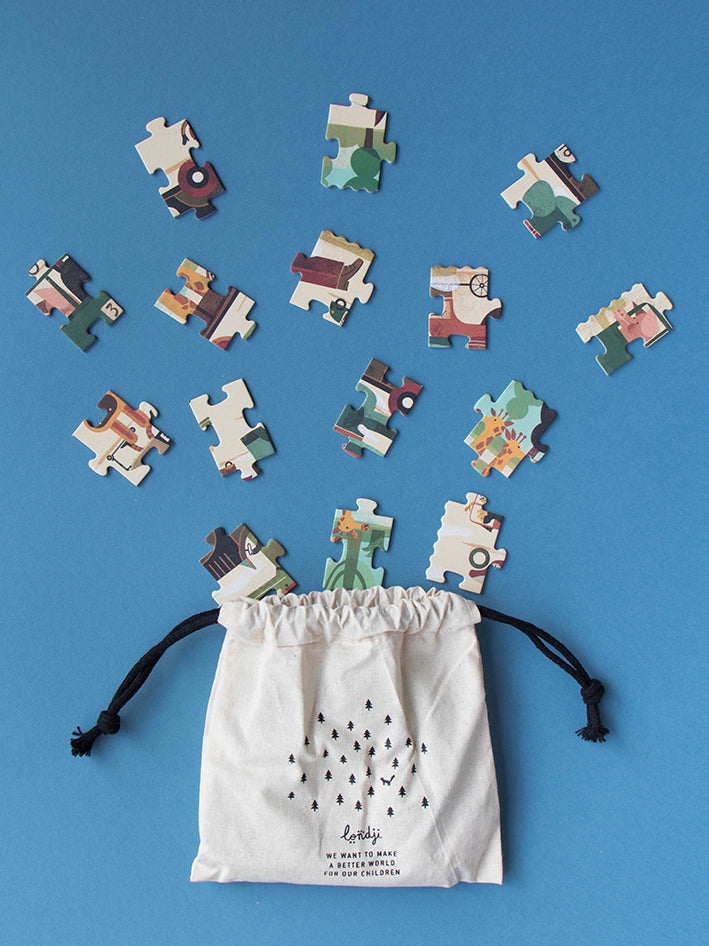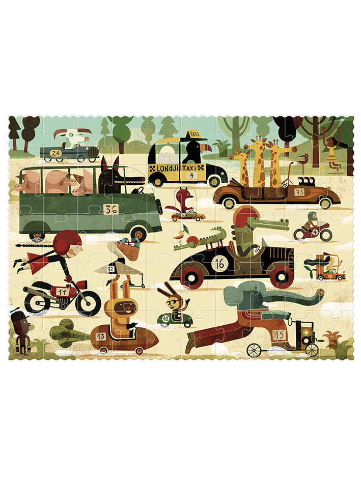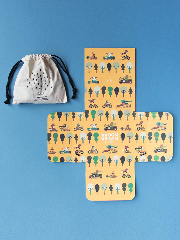 A 50 piece pocket-sized puzzle. We introduce you to the characters of this race. Who will arrive first? A sustainable puzzle, made of recycled paper and cardboard.
