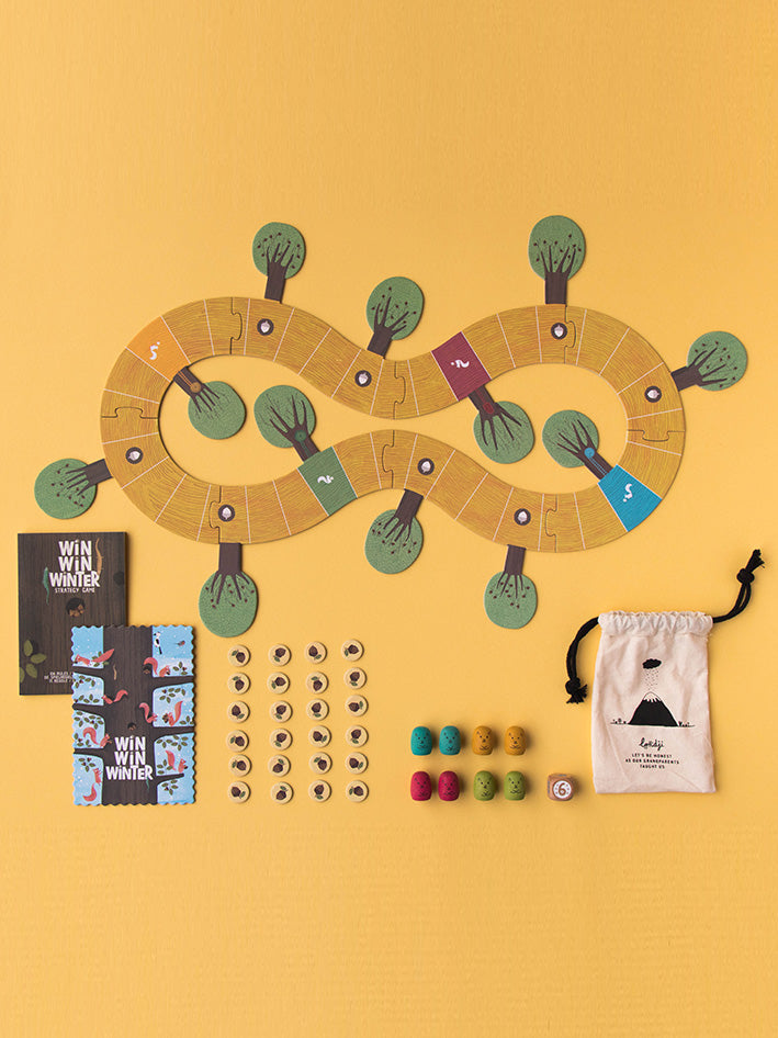 In this Win Win Winter Game by Londji the family of squirrels that collects the most acorns is the winner. Played in turns, each player rolls the dice and moves the squirrel family along the path.