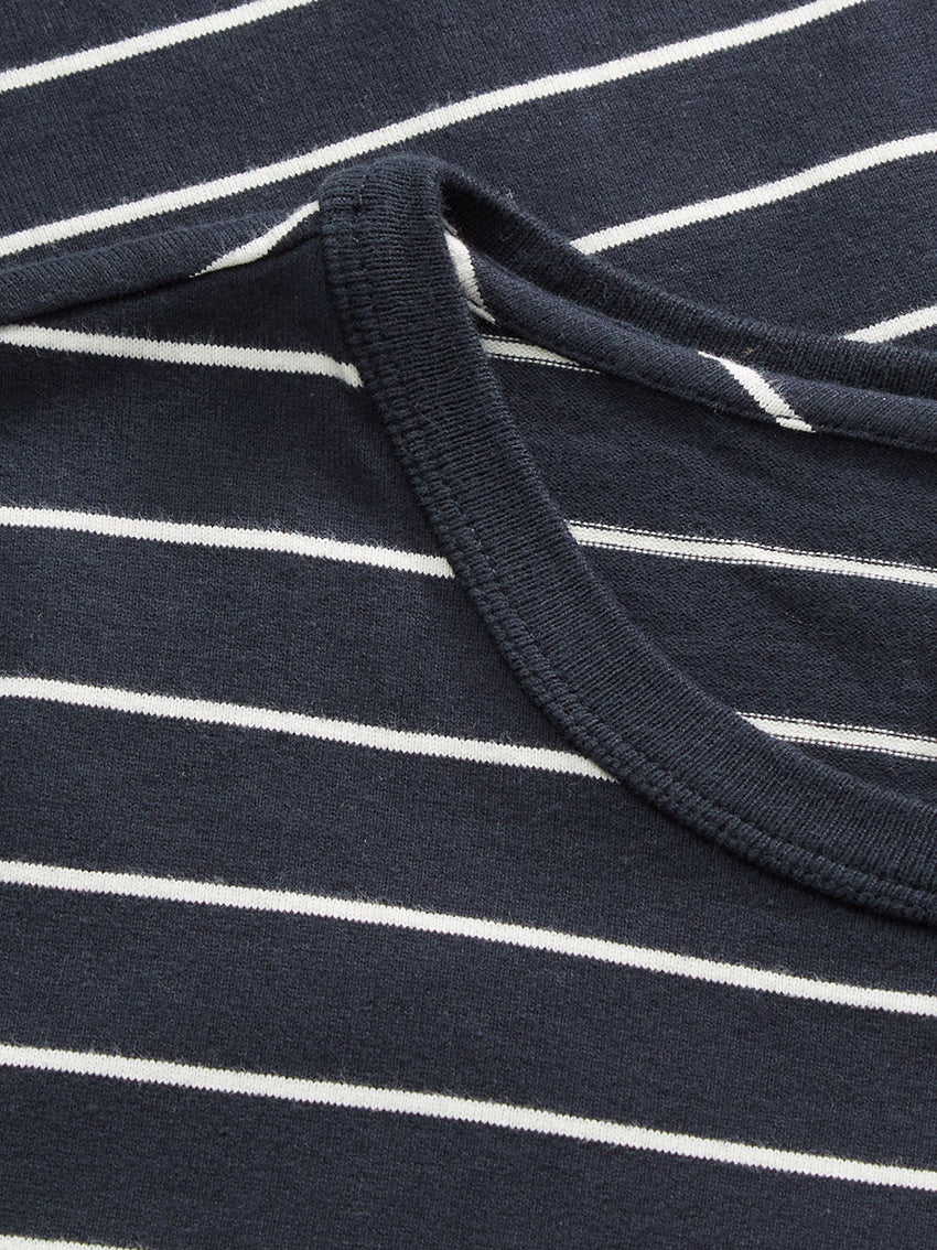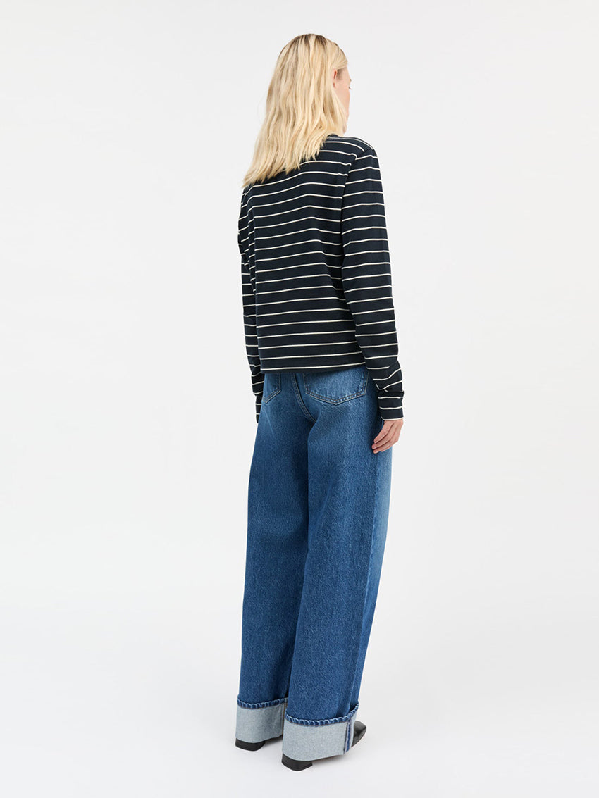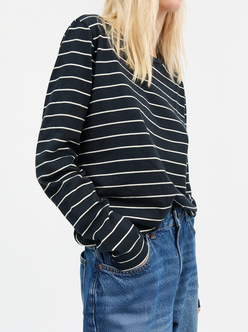 Made from 100% organic cotton heavy jersey, this minimalist Skall Studio Loui Top in Navy and White Stripes has an easy fit and long sleeves. The round neck is finished with rib. SIZE RECOMMENDATION Regular and relaxed fit. We recommend choosing your usual size. The model is 177 cm tall and is wearing a size S FABRIC AND CARE • 100% organic cotton • GOTS certified • Machine wash at max. 30 degrees • Produced in Portugal