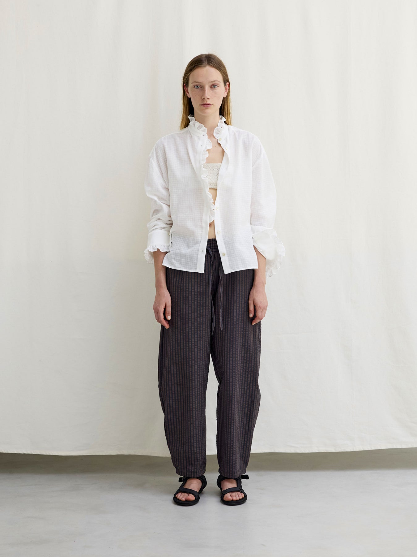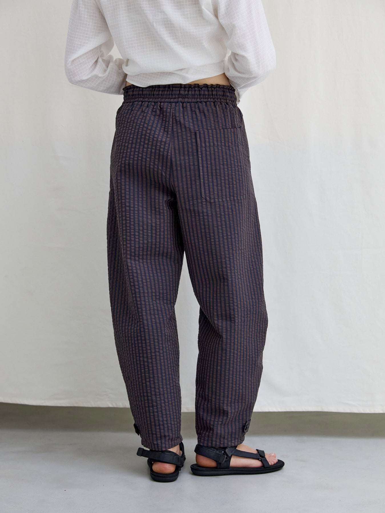 Balloon-leg pull-on pants in crisp striped cotton seersucker. Designed with an elasticated waistband, side pockets, and adjustable drawstrings, their voluminous silhouette adds a sense of modern ease to warm-weather dressing. Finished with button details at the ankles for a touch of structure and charm.
