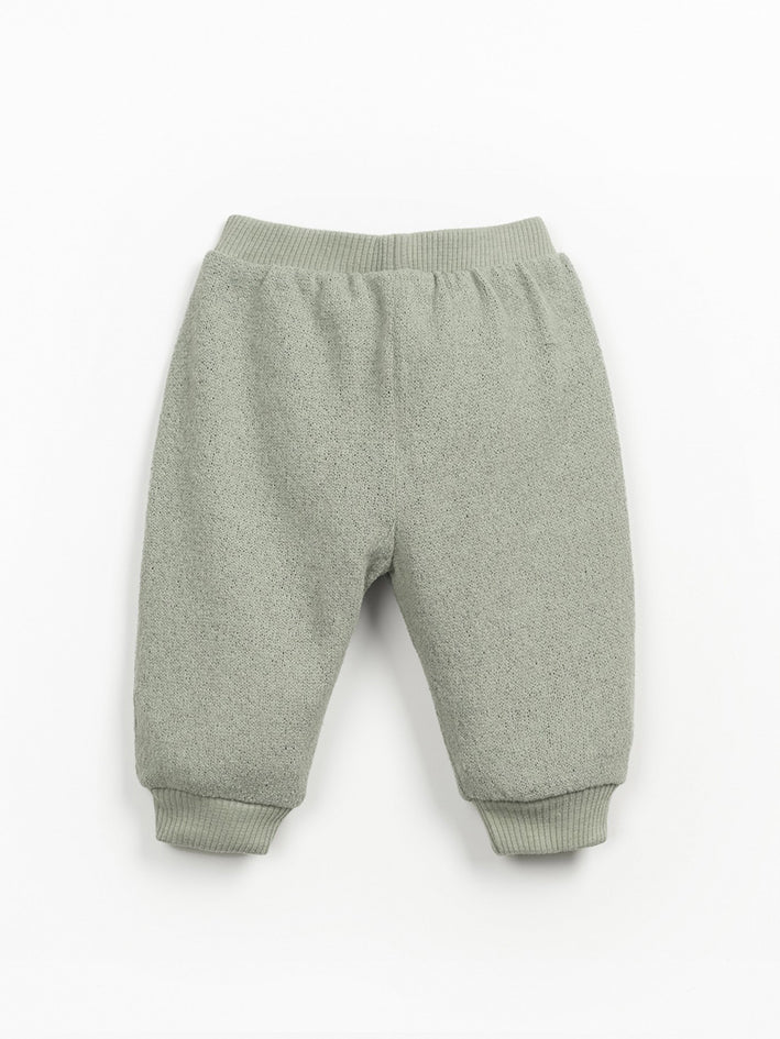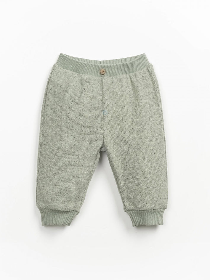 These Play Up Pants are made of knit fabric with a blend of cotton, recycled polyester, and other fibers, in Madalena Sage color. This model features a relaxed fit, elastic waistband, coconut button at the front, and ruched-effect fitted hems. 48.0% Cotton,27.0% Recycled Polyester,20.0% Recycled Cotton,5.0% Other Fibers