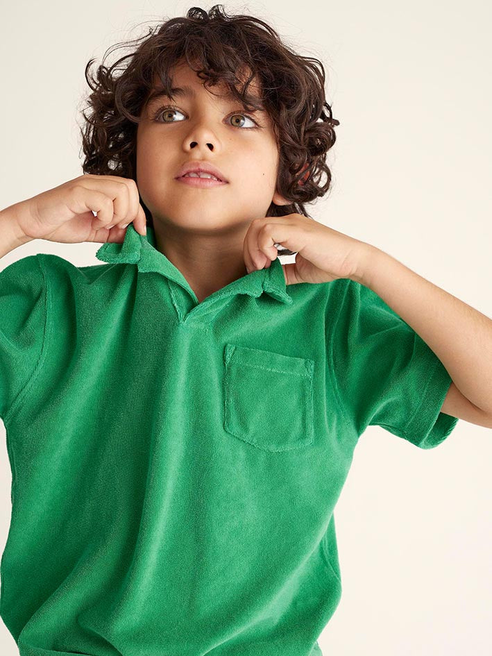 Make pool days and beach adventures even cozier with the fluffy Mael Organic Toweling Polo Shirt in Grass Green by My Little Cozmo! Unbuttoned Polo shirt for boys in fluffy and cozy organic cotton toweling. Short sleeves. 85% ORGANIC COTTON, 15% RECYCLED POLYESTER .KNIT